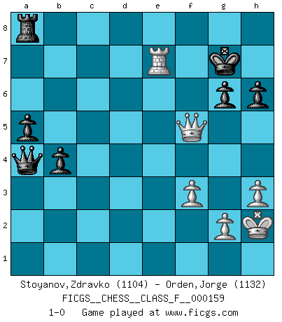 Last move : 1-0 2015 June 14 23:16:1 [Event "FICGS__CHESS__CLASS_F__000159"] [Site "FICGS"] [Date "2015.04.27"] [Round "1"] [White "Stoyanov,Zdravko"] [Black "Orden,Jorge"] [Result "1-0"] [WhiteElo "1104"] [BlackElo "1132"] 1.e4 c5 2.Nf3 d6 3.h3 Nf6 4.c3 e6 5.a3 Be7 6.Be2 O-O 7.O-O Nc6 8.Bb5 Bd7 9.Bxc6 Bxc6 10.d3 Qc7 11.Re1 e5 12.Be3 b5 13.b3 a5 14.Nbd2 h6 15.c4 b4 16.a4 Bd7 17.Kh2 Kh7 18.Qc1 Rg8 19.Nf1 Raf8 20.Ng3 Qc8 21.Ng1 Ne8 22.Nf5 Bxf5 23.exf5 Qxf5 24.Qd2 Nc7 25.Ne2 d5 26.cxd5 Nxd5 27.Ng3 Qg6 28.Rac1 Nc3 29.Ne4 Nxe4 30.dxe4 Rd8 31.Qe2 f5 32.exf5 Qxf5 33.Bxc5 Bxc5 34.Rxc5 Ra8 35.Rxe5 Qf7 36.Qe4+ Kh8 37.f3 Qxb3 38.Re6 Qxa4 39.Qe5 Kh7 40.Qf5+ g6 41.Re7+ Rg7 42.Rxg7+ Kxg7 43.Re7+ 1-0 Sicilian Kingside Castling by player Black (move 6) Kingside Castling by player White (move 7) Player White won this chess game. Follow this game move after move (download)Chess is played with the mind and not with the hands ! (Renaud and Kahn) Stelle das Brett so, daß die Sonne in die Augen deines Gegners scheint. (Ruy López) A la fecha, Fischer esta simplemente un nivel arriba de todos los mejores jugadores de Ajedrez del mundo. (John Jacobs) Aux échecs, les retours au sommet sont rares : les dommages psychologiques consécutifs à une défaite sont trop sévères. (Daily Telegraph) As a goal marker shodan is important. As a destination it is a poor place to stop. (Thomas Tamayo)