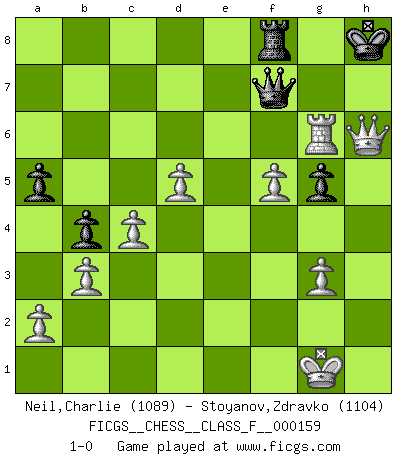 Last move : 1-0 2015 June 7 18:35:55 [Event "FICGS__CHESS__CLASS_F__000159"] [Site "FICGS"] [Date "2015.04.27"] [Round "1"] [White "Neil,Charlie"] [Black "Stoyanov,Zdravko"] [Result "1-0"] [WhiteElo "1089"] [BlackElo "1104"] 1.e4 c5 2.Nc3 a6 3.Nge2 Nc6 4.d4 cxd4 5.Nxd4 Nxd4 6.Qxd4 d6 7.Bd3 e5 8.Qd5 Nf6 9.Qb3 Be7 10.Bg5 h6 11.Bxf6 Bxf6 12.O-O O-O 13.Nd5 b5 14.Qb4 Bb7 15.Ne3 Be7 16.Nd5 Bxd5 17.exd5 Bf6 18.Be4 Be7 19.Rac1 f5 20.Bf3 Qd7 21.c4 Rfc8 22.b3 a5 23.Qd2 Bg5 24.Qd3 Bxc1 25.Rxc1 e4 26.Qc3 exf3 27.Qxf3 Rf8 28.g3 b4 29.Qh5 f4 30.Re1 fxg3 31.hxg3 Rf5 32.Qg4 Qf7 33.f4 Rf8 34.Re6 Rh5 35.Rxd6 g5 36.f5 Qe8 37.Re6 Qf7 38.Rg6+ Kh7 39.Qxh5 Kh8 40.Qxh6+ 1-0 Sicilian : Closed Kingside Castling by player White (move 12) Kingside Castling by player Black (move 12) Player White won this chess game. Follow this game move after move (download)First-class players lose to second class players because second-class players sometimes play a first-class game. (Tarrasch) Es ist nicht das erste mal, dass sich die FIDE dem Arabischen Geld gebeugt hat (über die FIDE WM 2004 in Lybien). (Larry Evans) El Ajedrez es un terrible juego. Si no controlas el centro, tu oponente tiene una posición mas holgada. Si tienes control del centro, ¡entonces realmente tu tienes algo de que preocuparte!. (Siegbert Tarrasch) Les Echecs sont affaire de jugement sensible. Savoir quand frapper et quand esquiver. (Fischer) You think that education is too expensive ? Try ignorance. (Derek Bok)