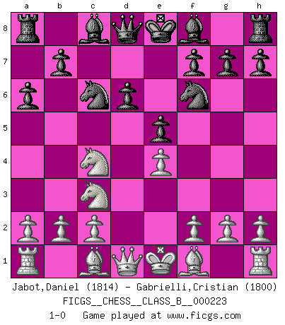 Last move : 1-0 2015 July 9 15:41:19 [Event "FICGS__CHESS__CLASS_B__000223"] [Site "FICGS"] [Date "2015.04.28"] [Round "1"] [White "Jabot,Daniel"] [Black "Gabrielli,Cristian"] [Result "1-0"] [WhiteElo "1814"] [BlackElo "1800"] 1.e4 c5 2.Nf3 Nc6 3.d4 cxd4 4.Nxd4 e5 5.Nb5 d6 6.N1c3 a6 7.Na3 Nf6 8.Nc4 1-0 This chess game has been lost on time (started : 2015.04.28 14:2:6) Sicilian : Labourdonnais-Loewenthal (Kalashnikov) variation Player White won this chess game. Follow this game move after move (download)Botvinnik tried to take the mystery out of Chess, always relating it to situations in ordinary life. He used to call Chess a typical inexact problem similar to those which people are always having to solve in everyday life. (Garry Kasparov) Über Kasparov: Es ist offensichtlich, daß er in einem totalitären Staat aufwuchs und deshalb zu diktatorischen Zügen neigt. (Viktor Kortschnoi) La pasion por jugar al Ajedrez es una de las mas inexplicables en el mundo. (H.G. Wells) La vie et les Echecs sont tous les deux une lutte constante. (Lasker) The Internet is the first thing that humanity has build that humanity doesn't understand, the largest experiment in anarchy that we have ever had. (Eric Schmidt)