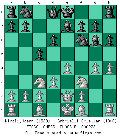 Last move : 1-0 2015 July 14 16:42:6 [Event "FICGS__CHESS__CLASS_B__000223"] [Site "FICGS"] [Date "2015.04.28"] [Round "1"] [White "Kirali,Hasan"] [Black "Gabrielli,Cristian"] [Result "1-0"] [WhiteElo "1838"] [BlackElo "1800"] 1.e4 e5 2.Nf3 Nf6 3.Nxe5 d6 4.Nf3 Be7 5.Nc3 Bg4 6.h3 Bh5 7.g4 Bg6 8.Qe2 c5 9.h4 h6 10.d3 1-0 This chess game has been lost on time (started : 2015.04.28 14:2:6) Petrov's defense Player White won this chess game. Follow this game move after move (download)The most important feature of the Chess position is the activity of the pieces. This is absolutely fundamental in all phases of the game: Opening, Middlegame and especially Endgame. The primary constraint on a piece's activity is the Pawn structure. (Michael Stean) Ein Isolani verdüstert die Stimmung auf dem ganzen Schachbrett. (Savielly Grigorievitsch Tartakower) El Ajedrez es 99 por ciento táctica. (Teichmann) Botvinnik disait en comparant les échecs à la musique: Il existe une science dont le but est l'étude de l'acoustique et des sons. Mais il y a aussi un art qui se sert de l'océan des sons : c'est la musique. De toute évidence, il en est de même pour la pensée. La logique est l'étude des lois de la réflexion et les échecs reflètent, en tant qu'art, le côté logique de la réflexion, sous la forme d'images artistiques... Extrait de Fischer - Spassky, Reykjavik 1972 par Alexander & F. Wyndham (Ed. Solar), p 37. A cynic is a man who knows the price of everything but the value of nothing. (Oscar Wilde)