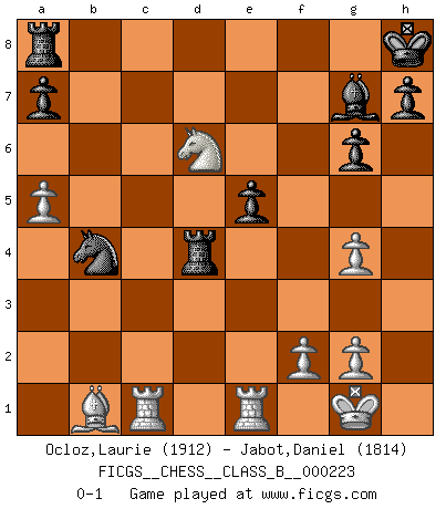 Last move : 0-1 2015 November 21 7:20:21 [Event "FICGS__CHESS__CLASS_B__000223"] [Site "FICGS"] [Date "2015.04.28"] [Round "1"] [White "Ocloz,Laurie"] [Black "Jabot,Daniel"] [Result "0-1"] [WhiteElo "1912"] [BlackElo "1814"] 1.d4 Nf6 2.c4 g6 3.Nc3 Bg7 4.e4 d6 5.Nf3 O-O 6.h3 Na6 7.Bg5 Qe8 8.Bd3 e5 9.d5 Nh5 10.O-O f5 11.Be3 Nf4 12.Bxf4 fxe4 13.Nxe4 Rxf4 14.a3 Qe7 15.b4 Nb8 16.Re1 Bh6 17.Nh2 b6 18.c5 bxc5 19.bxc5 Nd7 20.cxd6 cxd6 21.Ng4 Bg7 22.Rc1 Nb6 23.a4 Kh8 24.a5 Nxd5 25.Bb1 Nb4 26.Qxd6 Qxd6 27.Nxd6 Bxg4 28.hxg4 Rd4 0-1 This chess game has been lost on time (started : 2015.04.28 14:2:6) King's Indian : 5.Nf3 Kingside Castling by player Black (move 5) Kingside Castling by player White (move 10) Player Black won this chess game. Follow this game move after move (download)Chess is a more highly symbolic game, but the aggressions are therefore even more frankly represented in the play. It probably began as a war game; that is, the representation of a miniature battle between the forces of two kingdoms. (Karl Meninger) Mein erstes Ziel war nicht, die Partie zu gewinnen, sondern eine Figur zu opfern. -- der junge (Wilhelm Steinitz) Bobby Fischer es el jugador de Ajedrez mas grande que jamás haya existido. (Ken Smith) Je fais ceci parce que dans cinquante coups j'obtiendrai cela; je m'appelle Mikhail Moisevitch Botvinnik. (Botvinnik) Whatever you do, don't be bored. This is absolutely the most exciting time we could have possibly hoped to be alive. And things are just starting. (From movie Waking life)