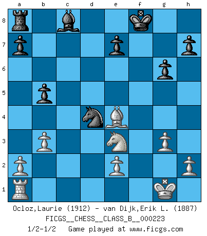 Last move : 1/2-1/2 2015 May 31 19:37:20 [Event "FICGS__CHESS__CLASS_B__000223"] [Site "FICGS"] [Date "2015.04.28"] [Round "1"] [White "Ocloz,Laurie"] [Black "van Dijk,Erik L."] [Result "1/2-1/2"] [WhiteElo "1912"] [BlackElo "1887"] 1.d4 Nf6 2.c4 g6 3.g3 Bg7 4.Nf3 O-O 5.Bg2 c6 6.Nc3 d5 7.cxd5 cxd5 8.O-O Ne4 9.Nxe4 dxe4 10.Ne5 Qd5 11.b3 f6 12.Nc4 Nc6 13.Bb2 f5 14.f3 b5 15.fxe4 fxe4 16.Rxf8+ Kxf8 17.Ne3 Bxd4 18.Qxd4 Qxd4 19.Bxd4 Nxd4 20.Bxe4 1/2-1/2 King's Indian : 3.g3 Kingside Castling by player Black (move 4) Kingside Castling by player White (move 8) This chess game ended in a draw. Follow this game move after move (download)Good positions don't win games, good moves do. (Gerald Abrahams) Schach ist mein Leben, meine Leidenschaft, was ich gelernt habe und seit meinem 14. Lebensjahr profimässig praktiziere. Darauf zu verzichten, würde mir sehr schwer fallen. (Viktor Kortschnoi) El juego de Damas es para vagabundos. (Paul Morphy) On a dit que l'homme se distingue de l'animal par le fait qu'il achète plus de livres qu'il ne peut en lire. Je voudrais suggérer qu'inclure à la liste des livres quelques livres d'échecs rendrait la distinction manifeste. (Edward Lasker) History is the quarrels of popes and kings, with wars or pestilences in every page; the men all so good for nothing, and hardly any women at all. (Jane Austen)