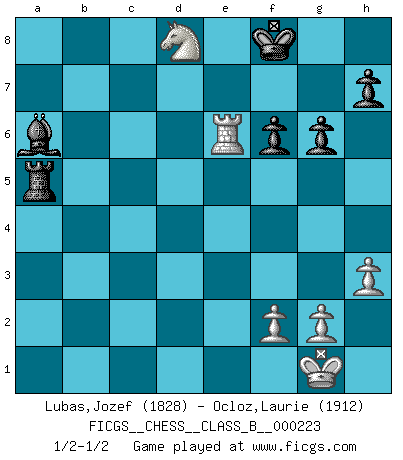 Last move : 1/2-1/2 2015 May 22 16:32:16 [Event "FICGS__CHESS__CLASS_B__000223"] [Site "FICGS"] [Date "2015.04.28"] [Round "1"] [White "Lubas,Jozef"] [Black "Ocloz,Laurie"] [Result "1/2-1/2"] [WhiteElo "1828"] [BlackElo "1912"] 1.e4 c5 2.Nf3 g6 3.c3 Bg7 4.d4 cxd4 5.cxd4 d5 6.e5 Nc6 7.Bb5 Nh6 8.O-O O-O 9.Re1 f6 10.exf6 exf6 11.h3 Re8 12.Rxe8+ Qxe8 13.Nc3 Be6 14.Na4 Nf5 15.Nc5 Bf7 16.Nxb7 Rb8 17.Bxc6 Qxc6 18.Nc5 Bf8 19.Nd3 Qa6 20.b3 Re8 21.Nc5 Qe2 22.Qxe2 Rxe2 23.Bf4 Rb2 24.Nd3 Rc2 25.Bb8 Rc3 26.Nfe1 Nxd4 27.Bxa7 Nb5 28.Be3 Rc8 29.a4 d4 30.Bd2 Nc3 31.Nf3 Bxb3 32.Nxd4 Bc4 33.Bxc3 Bxd3 34.Bb2 Ba6 35.Ne6 Be7 36.Nf4 Rd8 37.Ba3 Bxa3 38.Rxa3 Rd4 39.Ne6 Rc4 40.a5 Kf7 41.Re3 Ra4 42.Nd8+ Kf8 43.Re6 Rxa5 1/2-1/2 Sicilian : Hungarian variation Kingside Castling by player White (move 8) Kingside Castling by player Black (move 8) This chess game ended in a draw. Follow this game move after move (download)The tactician must know what to do whenever something needs doing; the strategist must know what to do when nothing needs doing. (Savielly Tartakover) Oft bringt ein stiller Zug das Erdbeben. (Richard Reti) Uno no tiene que jugar muy bien, es suficiente jugar mejor que el oponente. (Siegbert Tarrasch) Soyez une menace à chaque fois que vous vous asseyez pour jouer. (Ken Smith) Every now and then a man's mind is stretched by a new idea and never shrinks back to its former dimensions. (Oliver Wendell Holmes, Sr.)