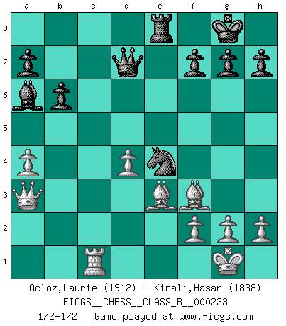 Last move : 1/2-1/2 2015 June 12 12:47:16 [Event "FICGS__CHESS__CLASS_B__000223"] [Site "FICGS"] [Date "2015.04.28"] [Round "1"] [White "Ocloz,Laurie"] [Black "Kirali,Hasan"] [Result "1/2-1/2"] [WhiteElo "1912"] [BlackElo "1838"] 1.d4 Nf6 2.c4 e6 3.Nf3 d5 4.Nc3 c6 5.Bg5 Nbd7 6.e3 Qa5 7.Nd2 Bb4 8.Qc2 O-O 9.Be2 c5 10.Bf4 cxd4 11.exd4 Bxc3 12.bxc3 Re8 13.O-O e5 14.Be3 b6 15.a4 exd4 16.cxd4 Ba6 17.Rfc1 Rac8 18.Qb2 Rc6 19.Qa3 dxc4 20.Nxc4 Qd5 21.Bf3 Ne4 22.Nd2 Ndf6 23.Rxc6 Qxc6 24.Nxe4 Nxe4 25.Rc1 Qd7 1/2-1/2 Queen's pawn game Kingside Castling by player Black (move 8) Kingside Castling by player White (move 13) This chess game ended in a draw. Follow this game move after move (download)As one by one I mowed them down, my superiority soon became apparent. (Jose Capablanca) Frage des Reporters: -Welche besonderen Umstände rechtfertigen das Anhalten der Uhren während einer Turnierpartie? Antwort: -Einen Fotographen zu strangulieren. (Siegbert Tarrasch) Un Peón pasado aumenta su poder a medida de que el número de piezas en el tablero disminuye. (Capablanca) Comme les marins qui ont mille raisons différentes d'aller en mer, les joueurs d'échecs en ont tout autant avant de s'installer devant une table et jouer... (Vincent Bertignac, philosophe) Don't be discouraged. It's often the last key in the bunch that opens the lock. (Author unknown)