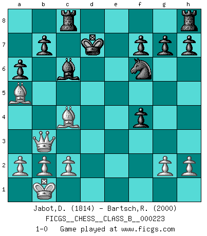 Last move : 1-0 2015 July 3 14:30:26 [Event "FICGS__CHESS__CLASS_B__000223"] [Site "FICGS"] [Date "2015.04.28"] [Round "1"] [White "Jabot,Daniel"] [Black "Bartsch,Reinhard Andrea"] [Result "1-0"] [WhiteElo "1814"] [BlackElo "2000"] 1.e4 c5 2.Nf3 d6 3.d4 cxd4 4.Nxd4 Nf6 5.Nc3 Bd7 6.Bg5 Nc6 7.Qd2 Nxd4 8.Qxd4 Qa5 9.Bd2 e5 10.Qd3 Rc8 11.O-O-O a6 12.Kb1 Ng4 13.Nd5 Qc5 14.Qb3 Qc6 15.Be1 Nf6 16.Bd3 Be7 17.Nxe7 Kxe7 18.f4 exf4 19.e5 dxe5 20.Bb4+ Ke8 21.Rhe1 Qe6 22.Rxe5 Qxe5 23.Re1 Qxe1+ 24.Bxe1 Bc6 25.Bc4 Kd7 26.Ba5 1-0 Sicilian Queenside Castling by player White (move 11) Player White won this chess game. Follow this game move after move (download)To avoid losing a piece, many a person has lost the game. (Savielly Tartakover) Später, ... hatte ich zunehmend Erfolg in entscheidenden Partien. Vielleicht weil ich eine einfache Wahrheit erkannte: nicht nur ich hatte Angst, auch mein Gegner. (Mikhail Nekhemyevich Tal) a manera como él juega al Ajedrez, demuestra la completa naturaleza de un hombre. (Stanley Ellin) Horreur, mais aussi harmonie suprême : qu'y avait-il en effet au monde en dehors des échecs ? Le brouillard, l'inconnu, le non-être... (Vladimir Nabokov) It's not enough to succeed. Others must fail. (Gore Vidal)