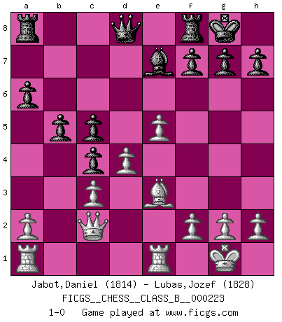 Last move : 1-0 2015 August 9 8:21:5 [Event "FICGS__CHESS__CLASS_B__000223"] [Site "FICGS"] [Date "2015.04.28"] [Round "1"] [White "Jabot,Daniel"] [Black "Lubas,Jozef"] [Result "1-0"] [WhiteElo "1814"] [BlackElo "1828"] 1.e4 e5 2.Nf3 Nc6 3.Bb5 a6 4.Ba4 Nf6 5.O-O Be7 6.Re1 b5 7.Bb3 O-O 8.c3 d5 9.d4 exd4 10.e5 Ne4 11.cxd4 Bf5 12.Nc3 Nxc3 13.bxc3 Na5 14.Bc2 Bxc2 15.Qxc2 Nc4 16.Nd2 c5 17.Nxc4 dxc4 18.Be3 1-0 Ruy Lopez : Closed, 7...O-O Kingside Castling by player White (move 5) Kingside Castling by player Black (move 7) Player White won this chess game. Follow this game move after move (download)The hallmark of the artist is simplicity. (Larry Evans) Nie in meinem Leben habe ich die französische Verteidigung gespielt, welche die Stumpfsinnigste von allen ist. (Wilhelm Steinitz) Realmente no sabemos como el juego fue inventado, aunque hay sospechas. Tan pronto como descubramos a los culpables, se los haremos saber. (Bruce Pandolfini) Avec des compensations pour le matériel en plus... (Anonyme) Man is reluctant to give credit for intelligence to anyone, except his enemies. (Albert Einstein)