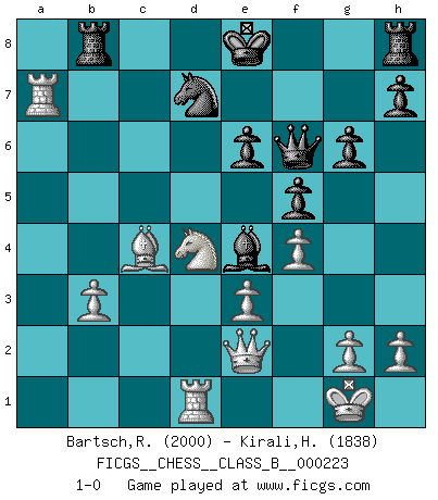 Last move : 1-0 2015 July 13 14:31:55 [Event "FICGS__CHESS__CLASS_B__000223"] [Site "FICGS"] [Date "2015.04.28"] [Round "1"] [White "Bartsch,Reinhard Andrea"] [Black "Kirali,Hasan"] [Result "1-0"] [WhiteElo "2000"] [BlackElo "1838"] 1.d4 d5 2.c4 c6 3.Nf3 Nf6 4.Nc3 e6 5.e3 Nbd7 6.Qc2 Be7 7.Bd3 dxc4 8.Bxc4 b5 9.Bd3 b4 10.Ne4 Nxe4 11.Bxe4 Bb7 12.a3 bxa3 13.O-O Rb8 14.b3 f5 15.Bd3 c5 16.Bc4 Bd6 17.Rd1 cxd4 18.Nxd4 Qh4 19.f4 Be4 20.Qe2 Qf6 21.Bxa3 Bxa3 22.Rxa3 g6 23.Rxa7 1-0 QGD Slav : 4.Nc3 Kingside Castling by player White (move 13) Player White won this chess game. Follow this game move after move (download)Chess is ruthless: you've got to be prepared to kill people. (Nigel Short) Habe Mut, dich deines eigenen Verstandes zu bedienen. (Immanuel Kant) Antes de los Finales, los dioses han colocado el Juego Medio. (Siegbert Tarrasch) Que feriez-vous si vous étiez en train de jouer aux échecs et que la fin du monde arrive ? Je continuerais à jouer. (Saint Borromée) Always remember that you are unique; just like everyone else. (Unknown)