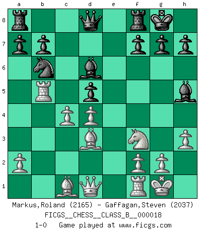 Last move : 1-0 2007 June 7 0:25:19 [Event "FICGS__CHESS__CLASS_B__000018"] [Site "FICGS"] [Date "2007.03.03"] [Round "1"] [White "Markus,Roland"] [Black "Gaffagan,Steven"] [Result "1-0"] [WhiteElo "2165"] [BlackElo "2037"] 1.e4 e5 2.Nf3 Nf6 3.Nxe5 d6 4.Nf3 Nxe4 5.d4 d5 6.Bd3 Bd6 7.O-O O-O 8.c4 c6 9.cxd5 cxd5 10.Nc3 Nxc3 11.bxc3 Bg4 12.Rb1 Nd7 13.h3 Bh5 14.Rb5 Nb6 15.c4 1-0 This chess game has been lost on time (started : 2007.03.03 20:30:22) Petrov : Classical attack, Marshall variation Kingside Castling by player White (move 7) Kingside Castling by player Black (move 7) Player White won this chess game. Follow this game move after move (download)He who fears an isolated Queen's Pawn should give up Chess. (Siegbert Tarrasch) Nach Morphy wurde nichts neues mehr in der Behandlung offener Positionen gefunden. (Mikhail Moiseyevich Botvinik) Si el Ajedrez es una ciencia, es la mas inexacta. Si el Ajedrez es un arte, es demasiado inexacto para ser visto como tal. Si el Ajedrez es un deporte, es demasiado esotérico. Si el Ajedrez es un juego, es demasiado exigente para ser solo un juego. Si el Ajedrez es una aventura, es una muy demandante. Si el Ajedrez es una pasión, es una muy gratificante. Si el Ajedrez es la vida, es una muy triste. (Anónimo) Vous m'avez demandé de vous exposer quel est le fondement de la prière. Je ne fais que préparer les pièces du jeu sur la table... Nous sera-t-il permis d'en adopter les règles et si nous les appliquons scrupuleusement nous ne tarderons pas à faire mat le Roi divin ! Il ne pourra échapper à nos mains. (Sainte Thérèse d'Avila, Chemin de perfection) Do not put your faith in what statistics say until you have carefully considered what they do not say. (William W. Watt)