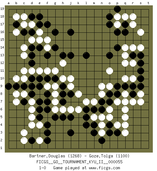 Last move : 1-0 2015 November 5 5:27:25 [Event "FICGS__GO__TOURNAMENT_KYU_II__000055"] [Site "FICGS"] [Date "2015.04.29"] [Round "1"] [Black "Bartner,Douglas"] [White "Goze,Tolga"] [Result "1-0"] [Rating 1 "1268"] [Rating 2 "1100"] 1.q16 d4 2.c16 q4 3.e17 c11 4.f3 d6 5.d2 c3 6.j3 c14 7.j16 r14 8.o17 q10 9.o4 q6 10.p3 q3 11.l4 n3 12.o3 e15 13.g16 d17 14.d16 e16 15.f17 c17 16.b17 b18 17.e18 b16 18.p14 q12 19.o13 s16 20.j13 r17 21.g14 p18 22.o18 p17 23.p16 o11 24.d10 d11 25.e10 e11 26.f10 f11 27.g10 g11 28.f7 f5 29.h7 h10 30.h9 j9 31.j8 j10 32.l13 g9 33.h8 c10 34.d8 c8 35.c7 d7 36.c9 b8 37.b9 e8 38.d9 b7 39.e7 b10 40.a9 m5 41.m4 n4 42.n2 o5 43.m3 n5 44.d18 c18 45.r9 r7 46.q9 o9 47.s11 r10 48.s10 s8 49.s13 s14 50.r13 q13 51.s9 r12 52.s12 q14 53.o8 n8 54.p9 n9 55.o7 k8 56.r8 s7 57.q7 p7 58.p6 q8 59.p5 o6 60.n7 m7 61.p8 q7 62.m6 p4 63.l5 q5 64.n6 l7 65.l6 k6 66.e14 c2 67.e6 e2 68.f2 d5 69.d14 d15 70.p19 q18 71.q17 r18 72.e5 e4 73.f4 h6 74.j5 j6 75.h5 g6 76.g5 g7 77.f8 g8 78.f6 f9 79.e9 f14 80.f13 f15 81.d13 h12 82.h13 c13 83.d12 1-0 This go game has been lost on time (started : 2015.04.29 10:37:24) Here are the names of the openings (joseki) played in the four corners : Corner d4 : d4 f3 Hoshi (Hwajeom, Seongjeom, Xingwei`) 4-4 Point. The star or hoshi (4-4) point, emphasizing influence at the potential expense of territory. Ikken Kakari (Hankan Keolch'im, Yi Gua`jiao~, 1-Space Low Approach). Black 2 is the standard approach move to the 4-4. Corner q16 : q16 r14 Hoshi (Hwajeom, Seongjeom, Xingwei`) 4-4 Point. The star or hoshi (4-4) point, emphasizing influence at the potential expense of territory. Ikken Kakari (Hankan Keolch'im, Yi Gua`jiao~, 1-Space Low Approach). White 2 is the standard approach move to the 4-4. Corner q4 : q4 o4 Hoshi (Hwajeom, Seongjeom, Xingwei`) 4-4 Point. The star or hoshi (4-4) point, emphasizing influence at the potential expense of territory. Ikken Takagakari (Hankan Nop'dakeolch'im, Yi Gaojia, 1-Space High Approach). White typically responds at 6-4 or 3-10. White 4-10 is played when White finds play on the right side advantageous. White 4-8 or 3-8 may be played when White has support at top. Player Black won this Go (weiqi, baduk) game. Follow this game move after move (download)To invade, need 20 points in open area; otherwise, keshi is best. (Yang Yilun, 7p) Luck is when opportunity knocks and you answer. (Anonymous)