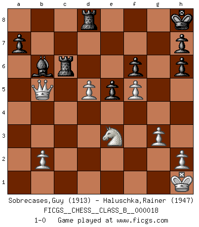 Last move : 1-0 2007 December 14 20:53:55 [Event "FICGS__CHESS__CLASS_B__000018"] [Site "FICGS"] [Date "2007.03.03"] [Round "1"] [White "Sobrecases,Guy"] [Black "Haluschka,Rainer"] [Result "1-0"] [WhiteElo "1913"] [BlackElo "1947"] 1.e4 c5 2.Nf3 d6 3.d4 Nf6 4.Nc3 cxd4 5.Nxd4 Nc6 6.Bc4 Qb6 7.Nb3 e6 8.Be3 Qc7 9.O-O Be7 10.Bd3 O-O 11.f4 b6 12.Qf3 Nb4 13.Rac1 Nxd3 14.cxd3 Qd7 15.Qg3 Ba6 16.f5 Kh8 17.a4 e5 18.Rf3 Bxd3 19.Bh6 Rg8 20.Rxd3 gxh6 21.Qf3 Rg4 22.Rd2 Rag8 23.Re2 d5 24.Nxd5 Nxd5 25.Rd1 Rf4 26.Qd3 Rd8 27.exd5 f6 28.Rc2 Qxa4 29.Rc7 Bd6 30.Ra1 Qxa1+ 31.Nxa1 Bxc7 32.Nc2 b5 33.g3 Bb6+ 34.Kh1 Rc4 35.Ne3 Rc6 36.Qxb5 1-0 This chess game has been lost on time (started : 2007.03.03 20:30:22) Sicilian Kingside Castling by player White (move 9) Kingside Castling by player Black (move 10) Player White won this chess game. Follow this game move after move (download)Chess is a terrific way for kids to build self image and self esteem. (Saudin Robovic) Mein Name ist Rustam Kamsky. Sie haben meinen Sohn belästigt. Bereiten Sie sich aufs Sterben vor. (Rustam Kamsky) Realmente no sabemos como el juego fue inventado, aunque hay sospechas. Tan pronto como descubramos a los culpables, se los haremos saber. (Bruce Pandolfini) Des points faibles ou des trous dans la position de l'adversaire doivent être occupés par des pièces et non pas par des pions. (Siegbert Tarrasch) As the days dwindle down... to a precious few. (Maxwell Anderson)