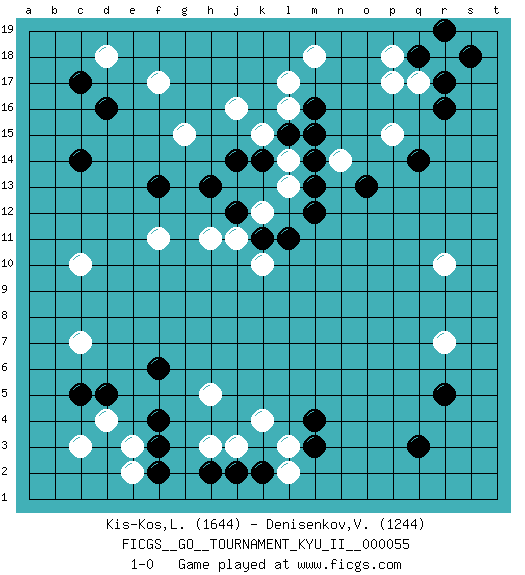 Last move : 1-0 2015 July 18 5:26:44 [Event "FICGS__GO__TOURNAMENT_KYU_II__000055 "] [Site "FICGS"] [Date "2015.04.29"] [Round "1"] [Black "Kis-Kos,Laszlo "] [White "Denisenkov,Valentin "] [Result "1-0"] [Rating 1 "1644"] [Rating 2 "1244"] 1.r16 d4 2.q3 p17 3.d16 f17 4.c14 d18 5.c17 j16 6.r5 k4 7.q14 c10 8.m16 r18 9.s18 p15 10.q18 p18 11.r17 q17 12.r19 m18 13.o13 n14 14.m12 r10 15.l15 l14 16.k14 k15 17.m14 l13 18.m13 k12 19.j14 g15 20.h13 h11 21.f13 f11 22.j12 j11 23.k11 k10 24.l11 l16 25.m15 l17 26.m4 r7 27.f3 e3 28.f4 h3 29.d5 c3 30.c5 c7 31.f6 l3 32.m3 h5 33.f2 e2 34.k2 l2 35.h2 j3 36.j2 1-0 This go game has been lost on time (started : 2015.04.29 10:37:24) Here are the names of the openings (joseki) played in the four corners : Corner q16 : r16 p17Komoku (Somok, Xiao~mu`) 3-4 Point. The komoku (3-4) point is the traditional corner enclosure move..Ikken Kakari (Hankan Keolch'im, Yi Gua`jiao~, 1-Space Low Pincer). The small knight move is the basic approach move to the 3-4 point stone. It has been continually used for over four centuries. There are limitless variations, with new moves constantly being discovered. White 2 opens the door to a treaure store of joseki. Corner d16 : d16 f17Hoshi (Hwajeom, Seongjeom, Xingwei`) 4-4 Point. The star or hoshi (4-4) point, emphasizing influence at the potential expense of territory.Ikken Kakari (Hankan Keolch'im, Yi Gua`jiao~, 1-Space Low Approach). White 2 is the standard approach move to the 4-4. Corner d4 : d4 f3Hoshi (Hwajeom, Seongjeom, Xingwei`) 4-4 Point. The star or hoshi (4-4) point, emphasizing influence at the potential expense of territory.Ikken Kakari (Hankan Keolch'im, Yi Gua`jiao~, 1-Space Low Approach). Black 2 is the standard approach move to the 4-4. Player Black won this Go (weiqi, baduk) game.Follow this game move after move (download ) Error is one of the sources of transformation. (Pierre Audouard) Chess is as much a mystery as women. (Purdy)
