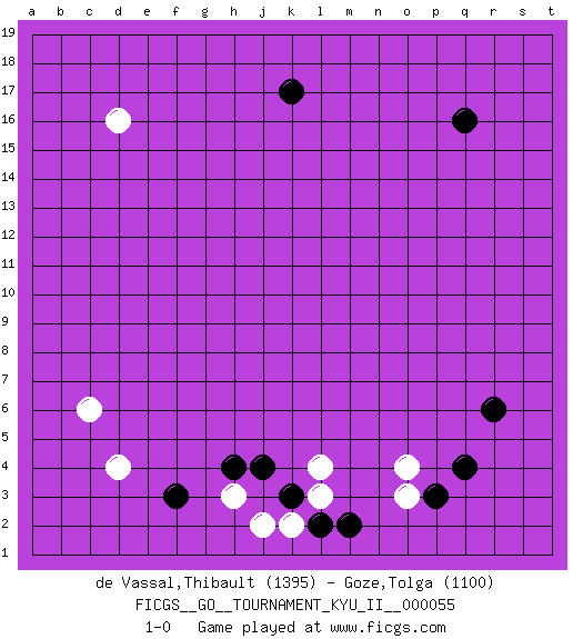 Last move : 1-0 2015 June 18 13:28:40 [Event "FICGS__GO__TOURNAMENT_KYU_II__000055"] [Site "FICGS"] [Date "2015.04.29"] [Round "1"] [Black "de Vassal,Thibault"] [White "Goze,Tolga"] [Result "1-0"] [Rating 1 "1395"] [Rating 2 "1100"] 1.q4 d16 2.q16 d4 3.f3 c6 4.j4 o3 5.p3 o4 6.r6 l3 7.k3 l4 8.k17 h3 9.h4 k2 10.l2 j2 11.m2 1-0 This go game has been lost on time (started : 2015.04.29 10:37:24) Here are the names of the openings (joseki) played in the four corners : Corner d4 : d4 f3 Hoshi (Hwajeom, Seongjeom, Xingwei`) 4-4 Point. The star or hoshi (4-4) point, emphasizing influence at the potential expense of territory. Ikken Kakari (Hankan Keolch'im, Yi Gua`jiao~, 1-Space Low Approach). Black 2 is the standard approach move to the 4-4. Corner q4 : q4 o3 Hoshi (Hwajeom, Seongjeom, Xingwei`) 4-4 Point. The star or hoshi (4-4) point, emphasizing influence at the potential expense of territory. Ikken Kakari (Hankan Keolch'im, Yi Gua`jiao~, 1-Space Low Approach). White 2 is the standard approach move to the 4-4. Player Black won this Go (weiqi, baduk) game. Follow this game move after move (download)Always remember, keep the balance. [between territory and influence] (Figaro) The Internet is the world's largest library. It's just that all the books are on the floor. (John Allen Paulos)