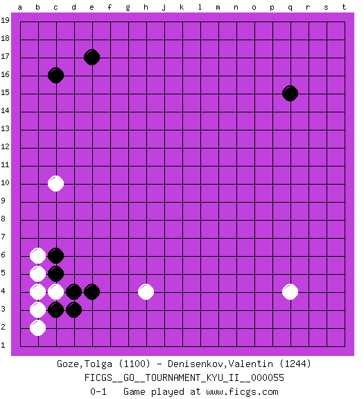 Last move : 0-1 2015 June 17 13:28:7 [Event "FICGS__GO__TOURNAMENT_KYU_II__000055"] [Site "FICGS"] [Date "2015.04.29"] [Round "1"] [Black "Goze,Tolga"] [White "Denisenkov,Valentin"] [Result "0-1"] [Rating 1 "1100"] [Rating 2 "1244"] 1.q15 c4 2.c16 q4 3.e17 c10 4.e4 h4 5.c3 b3 6.d3 b2 7.c5 b5 8.d4 b4 9.c6 b6 0-1 This go game has been lost on time (started : 2015.04.29 10:37:24) Here are the names of the openings (joseki) played in the four corners : Corner d4 : c4 e4 Komoku (Somok, Xiao~mu`) 3-4 Point. The komoku (3-4) point is the traditional corner enclosure move.. Ikken Takagakari (Hankan Nop'dakeolch'im, Yi Gaogua`jiao~, 1-Space High Approach). The 5-4 approach move has become more popular in modern times, as modern Go emphasizes speed and influence. Player White won this Go (weiqi, baduk) game. Follow this game move after move (download)Don't make territory near thickness. (Anonymous) There are 10 types of people in this world: those who understand binary and those who don't. (Anonymous)