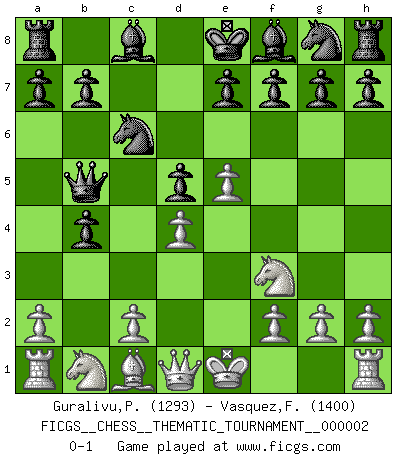 Last move : 0-1 2006 June 6 9:24:2 [Event "FICGS__CHESS__THEMATIC_TOURNAMENT__000002"] [Site "FICGS"] [Date "2006.05.30"] [Round "1"] [White "Guralivu,Paul-Iosif"] [Black "Vasquez,Fernando"] [Result "0-1"] [WhiteElo "1293"] [BlackElo "1400"] 1.e4 c5 2.b4 cxb4 3.d4 d5 4.e5 Nc6 5.Bb5 Qb6 6.Nf3 Qxb5 0-1 Sicilian : wing gambit Player Black won this chess game. Follow this game move after move (download)All my games are real. (Bobby Fischer) Ich liebe den Moment, wenn ich das Ego meines Gegenüber breche. (Robert James Fischer) El Ajedrez es de 30 a 40 por ciento psicología. Uno no cuenta con esto cuando se juega contra una computadora. No lo puedo confundir. (Judith Polgar) On entre au jeu d'Echecs comme on entre en Religion. Pour le joueur d'Echecs, la partie d'Echecs c'est l'office, la messe, le défilé du 1er Mai, le dépôt de gerbe au Monument aux Morts. C'est un drame sacré. (Michel Roos) Internal peace cannot coexist with external war. (Don Groves)
