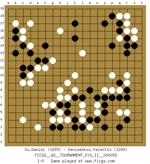 Last move : 1-0 2015 August 2 19:44:0 [Event "FICGS__GO__TOURNAMENT_KYU_II__000055"] [Site "FICGS"] [Date "2015.04.29"] [Round "1"] [Black "Xu,Daniel"] [White "Denisenkov,Valentin"] [Result "1-0"] [Rating 1 "1659"] [Rating 2 "1244"] 1.q16 c4 2.q3 d17 3.k17 e3 4.k3 r10 5.r13 r5 6.r4 q5 7.o3 d10 8.r8 q8 9.q9 r9 10.q7 p8 11.p7 o8 12.o7 p10 13.r7 l6 14.n7 n5 15.o5 m3 16.g3 f6 17.m4 l4 18.l3 l5 19.n4 n6 20.o6 k10 21.c10 c9 22.c11 d9 23.c14 c15 24.b15 c16 25.b16 b17 26.b13 h16 27.k15 r17 28.q17 r16 29.r15 s15 30.s14 q15 31.r14 q18 32.p18 r18 33.o17 s16 34.p14 l13 35.m8 k8 36.h6 h5 37.g5 g6 38.j5 h4 39.j6 g4 40.h3 j4 41.j8 j9 42.k7 h8 43.k4 j7 44.l7 h7 45.d11 e11 46.e12 f11 47.f12 g12 48.f14 d14 49.d13 1-0 This go game has been lost on time (started : 2015.04.29 10:37:24) Here are the names of the openings (joseki) played in the four corners : Corner q4 : q3 r5 Komoku (Somok, Xiao~mu`) 3-4 Point. The komoku (3-4) point is the traditional corner enclosure move.. Ikken Kakari (Hankan Keolch'im, Yi Gua`jiao~, 1-Space Low Pincer). The small knight move is the basic approach move to the 3-4 point stone. It has been continually used for over four centuries. There are limitless variations, with new moves constantly being discovered. White 2 opens the door to a treaure store of joseki. Corner d16 : d17 c11 Komoku (Somok, Xiao~mu`) 3-4 Point. The komoku (3-4) point is the traditional corner enclosure move.. Player Black won this Go (weiqi, baduk) game. Follow this game move after move (download)You can hide nothing on the goban. (Pierre Audouard) You cannot beat a roulette table unless you steal money from it. (Albert Einstein)