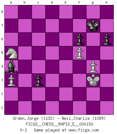 Last move : 0-1 2015 June 23 22:45:9 [Event "FICGS__CHESS__RAPID_E__000150"] [Site "FICGS"] [Date "2015.04.29"] [Round "1"] [White "Orden,Jorge"] [Black "Neil,Charlie"] [Result "0-1"] [WhiteElo "1132"] [BlackElo "1089"] 1.e4 e5 2.Nf3 Nc6 3.Bc4 Nf6 4.Nc3 Nxe4 5.Nxe4 d5 6.Bxd5 Qxd5 7.d3 Be7 8.O-O O-O 9.Be3 Be6 10.Nc3 Qd7 11.a3 a6 12.Re1 Rad8 13.d4 exd4 14.Nxd4 Nxd4 15.Bxd4 Qxd4 16.h3 Qxd1 17.Raxd1 Rxd1 18.Rxd1 Rd8 19.Rxd8+ Bxd8 20.g4 Bg5 21.Ne4 Bc1 22.Nc5 Bd5 23.Nd3 Be4 24.Nxc1 Bxc2 25.Kg2 g5 26.Kg3 Kg7 27.f4 h6 28.f5 f6 29.h4 gxh4+ 30.Kxh4 b5 31.Kg3 c5 32.Na2 a5 33.Nc3 b4 34.Ne2 c4 35.Nd4 Bd1 36.Nc6 bxa3 37.bxa3 c3 38.Nxa5 Ba4 0-1 Two knights defense Kingside Castling by player White (move 8) Kingside Castling by player Black (move 8) 10 pieces endgame at move 38 : White KNPPP , Black KBPPP WHITE : King + 1 Knight 3 Pawns BLACK : King + 1 Bishop 3 Pawns Player Black won this chess game. Follow this game move after move (download)Any material change in a position must come about by mate, a capture, or a Pawn promotion. (Purdy) Ich spiele 70 Eröffnungssysteme. (Viktor Kortschnoi) El Ajedrez demanda una total concentración. (Bobby Fischer) Botvinnik disait en comparant les échecs à la musique: Il existe une science dont le but est l'étude de l'acoustique et des sons. Mais il y a aussi un art qui se sert de l'océan des sons : c'est la musique. De toute évidence, il en est de même pour la pensée. La logique est l'étude des lois de la réflexion et les échecs reflètent, en tant qu'art, le côté logique de la réflexion, sous la forme d'images artistiques... Extrait de Fischer - Spassky, Reykjavik 1972 par Alexander & F. Wyndham (Ed. Solar), p 37. Somewhere in the world there is an epigram for every dilemma. (Hendrik Willem van Loon)