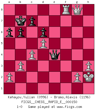 Last move : 1-0 2015 May 9 10:50:43 [Event "FICGS__CHESS__RAPID_E__000150"] [Site "FICGS"] [Date "2015.04.29"] [Round "1"] [White "Kehayov,Yulian"] [Black "Bromo,Alexis"] [Result "1-0"] [WhiteElo "0996"] [BlackElo "1196"] 1.e4 e5 2.Nf3 Nc6 3.d4 h6 4.d5 Nce7 5.Nxe5 Nf6 6.Bd3 d6 7.c4 b6 8.Nf3 Ng6 9.O-O Be7 10.Nc3 a6 11.b3 Bg4 12.h3 Bxf3 13.Qxf3 Ne5 14.Qe3 g5 15.Be2 Nh5 16.Bxh5 Qd7 17.f4 gxf4 18.Qxf4 Ng6 19.Bxg6 fxg6 20.Qf7+ Kd8 21.Qxg6 Rf8 22.Rxf8+ Bxf8 23.Bxh6 Bxh6 24.Qxh6 Kc8 25.Rf1 Kb7 26.Qg6 Re8 27.Rf7 Qd8 28.Rf5 Rg8 29.Qe6 Qh4 30.Ne2 Qe1+ 31.Kh2 Qxe2 32.Qxg8 Qxe4 33.Rf8 1-0 Scotch Opening Kingside Castling by player White (move 9) Player White won this chess game. Follow this game move after move (download)Man is a frivolous, a specious creature, and like a Chess player, cares more for the process of attaining his goal than for the goal itself. (Dostoyevsky) Es ist schade, dass viele Schachsportler vergessen, wie wichtig Auftreten und angemessene Kleidung sind. (Alexandra Kosteniuk) El sobresalir en el Ajedrez es un signo de una mente intrigante. (Sir Arthur Conan Doyle) Il vaut mieux sacrifier les pièces de l'adversaire. (Xavier Tartacover) Begin at the beginning and go on till you come to the end; then stop. (Lewis Carrol, Alice in Wonderland)
