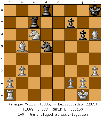 Last move : 1-0 2015 June 10 22:11:19 [Event "FICGS__CHESS__RAPID_E__000150"] [Site "FICGS"] [Date "2015.04.29"] [Round "1"] [White "Kehayov,Yulian"] [Black "Belaz,Egidio"] [Result "1-0"] [WhiteElo "0996"] [BlackElo "1285"] 1.e4 c5 2.Nf3 Nc6 3.d4 cxd4 4.Nxd4 Ne5 5.Bf4 d6 6.Be2 Nf6 7.Nc3 Qb6 8.O-O g6 9.b3 Bg7 10.Nd5 Qc5 11.c4 Ned7 12.Be3 Qa5 13.Qd2 Qxd2 14.Bxd2 Nxe4 15.Be3 O-O 16.Bf3 Nec5 17.Rfd1 Na6 18.Nxe7+ Kh8 19.Nxc8 Raxc8 20.h3 h6 21.Bxb7 Rcd8 22.Bxa6 Nc5 23.Bb5 Ne4 24.Nc6 Rc8 25.Nxa7 Rc7 26.Nc6 Bxa1 27.Rxa1 Nc3 28.Nd4 d5 29.cxd5 Nxd5 30.Bxh6 Rd8 31.Nc6 1-0 Sicilian defense Kingside Castling by player White (move 8) Kingside Castling by player Black (move 15) Player White won this chess game. Follow this game move after move (download)It is peculiar but a fact nevertheless, that gamblers in chess always have enthusiastic followers. (Botvinnik) Offensichtlich kennt Kasparow nichts anderes als Schach, und ich könnte 500 weitere Spieler dieser Sorte benennen. (Judith Polgar) Fischer deseaba darle a los Rusos una sopa de su propia medicina. (Larry Evans) Mon pion favori sur ma case favorite ! Bronstein en parlant d'un coup de pion en h5 quand il avait les Noirs. The Internet isn't free. It just has an economy that makes no sense to capitalism. (Brad Shapcott)