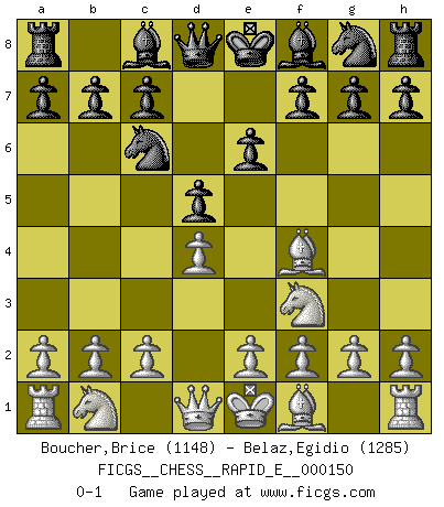 Last move : 0-1 2015 June 4 23:57:58 [Event "FICGS__CHESS__RAPID_E__000150"] [Site "FICGS"] [Date "2015.04.29"] [Round "1"] [White "Boucher,Brice"] [Black "Belaz,Egidio"] [Result "0-1"] [WhiteElo "1148"] [BlackElo "1285"] 1.d4 d5 2.Nf3 Nc6 3.Bf4 e6 0-1 This chess game has been lost on time (started : 2015.04.29 13:52:28) Queen's pawn game, Chigorin variation Player Black won this chess game. Follow this game move after move (download)Castle early and often. (Rob Sillars) Ivan Sokolov treibt mich als Beifahrer an mit go Loeky go - . (Loek van Wely) El Rey es una pieza de pelea. ¡Usenlo!. (Wilhelm Steinitz) Les Echecs sont affaire de jugement sensible. Savoir quand frapper et quand esquiver. (Fischer) Somehow our devils are never quite what we expect when we meet them face to face. (Nelson DeMille)