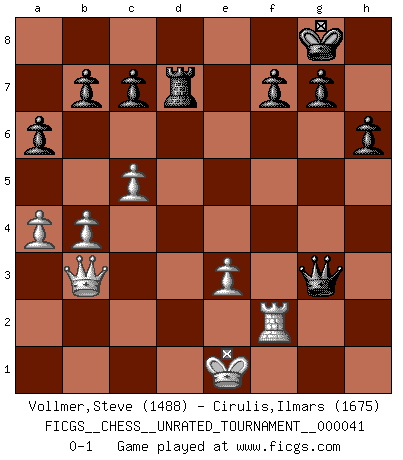 Last move : 0-1 2015 July 19 10:53:26 [Event "FICGS__CHESS__UNRATED_TOURNAMENT__000041"] [Site "FICGS"] [Date "2015.04.30"] [Round "1"] [White "Vollmer,Steve"] [Black "Cirulis,Ilmars"] [Result "0-1"] [WhiteElo "1488"] [BlackElo "1675"] 1.Nf3 d5 2.d4 a6 3.e3 Bf5 4.c4 e6 5.Nc3 Nc6 6.cxd5 exd5 7.Bd3 Bxd3 8.Qxd3 Nf6 9.O-O Be7 10.Bd2 O-O 11.Rac1 Re8 12.Rfd1 Nb4 13.Qb1 Nc6 14.Na4 Ne4 15.Nc5 Bxc5 16.dxc5 Re6 17.Bc3 Rg6 18.Be5 Nxe5 19.Nxe5 Rxg2+ 20.Kxg2 Qg5+ 21.Kf1 Qxe5 22.Qc2 Qxh2 23.Rxd5 Qh1+ 24.Ke2 Ng3+ 25.fxg3 Qxd5 26.Rf1 Rd8 27.Rf2 Qh5+ 28.Ke1 h6 29.b4 Qg4 30.Qb3 Rd7 31.a4 Qxg3 0-1 Reti Opening Kingside Castling by player White (move 9) Kingside Castling by player Black (move 10) Player Black won this chess game. Follow this game move after move (download)Chess is war over the board. The object is to crush the opponents mind. (Bobby Fischer) Die Idee von Capablanca, Schach als Fach in den Schulen zu lehren, ist großartig. (Fidel Castro) El estómago es una parte esencial del maestro de Ajedrez. (Bent Larsen) On a dit que l'homme se distingue de l'animal par le fait qu'il achète plus de livres qu'il ne peut en lire. Je voudrais suggérer qu'inclure à la liste des livres quelques livres d'échecs rendrait la distinction manifeste. (Edward Lasker) Indecision is the key to flexibility. (Unknown)