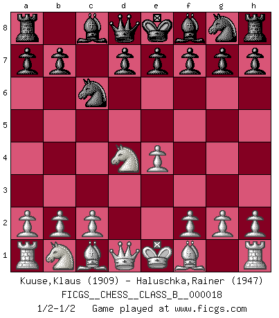 Last move : 1/2-1/2 2007 March 25 12:52:25 [Event "FICGS__CHESS__CLASS_B__000018"] [Site "FICGS"] [Date "2007.03.03"] [Round "1"] [White "Kuuse,Klaus"] [Black "Haluschka,Rainer"] [Result "1/2-1/2"] [WhiteElo "1909"] [BlackElo "1947"] 1.e4 c5 2.Nf3 Nc6 3.d4 cxd4 4.Nxd4 1/2-1/2 Sicilian defense This chess game ended in a draw. Follow this game move after move (download)Why must I lose to this idiot ? (Aron Nimzovich) Wenn Capablanka heute auf der Schachbühne erscheinen würde, hätte er ein halbes Jahr gebraucht um sich die Schachtheorie anzueignen. Und dann hätte er alles und jeden besiegt. (Mikhail Moiseyevich Botvinik) Yo he agregado estos principios a la ley: pongan los Caballos en acción antes de que los dos Alfiles sean desarrollados. (Emanuel Lasker) Un footballeur joue avec ses pieds, parfois avec sa tête. Un joueur d'échecs ne joue qu'avec sa tête. Et quand il ne joue plus, il meurt. (Jacob Murray) There is no instance of a country having benefited from prolonged warfare. (Sun Tzu)