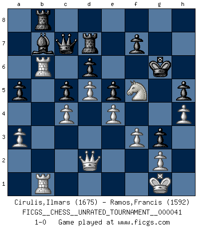 Last move : 1-0 2015 May 25 16:58:44 [Event "FICGS__CHESS__UNRATED_TOURNAMENT__000041"] [Site "FICGS"] [Date "2015.04.30"] [Round "1"] [White "Cirulis,Ilmars"] [Black "Ramos,Francis"] [Result "1-0"] [WhiteElo "1675"] [BlackElo "1592"] 1.b4 Nf6 2.a3 g6 3.e3 Bg7 4.Nf3 O-O 5.c4 d6 6.d4 b6 7.Be2 Bb7 8.O-O c5 9.Nc3 Nbd7 10.Qc2 e5 11.d5 Re8 12.e4 Nf8 13.bxc5 bxc5 14.Bg5 h6 15.Be3 g5 16.Rab1 Rb8 17.Qa4 a6 18.Rb3 Ng6 19.Rfb1 Qc7 20.h4 g4 21.Nh2 h5 22.Nf1 Nf4 23.Ng3 Red8 24.Nf5 Bf8 25.f3 Nxe2+ 26.Nxe2 a5 27.Bg5 Bg7 28.Neg3 Rd7 29.Nxg7 Kxg7 30.Nf5+ Kg6 31.Bxf6 Kxf6 32.Rb6 Kg6 33.Qd1 g3 34.Qd2 1-0 Polish (Sokolsky) opening Kingside Castling by player Black (move 4) Kingside Castling by player White (move 8) Player White won this chess game. Follow this game move after move (download)When the Chess game is over, the Pawn and the King go back to the same box. (Irish saying) Je mehr wir mit Computern analysieren, desto mehr glauben wir an Verteidigung. (Vladimir Kramnik) Personalmente, yo prefiero mirar hacia el futuro en donde un programa de computadora gane el título mundial de Ajedrez. La humanidad necesita una lección de humildad. (Richard Dawkings) Plusieurs personnes se sont demandées comment Tal faisait pour gagner... En fait, c'est très simple ! Il met ses pièces au centre de l'échiquier et les sacrifie quelque part ! (David Bronstein) Memory... is the diary that we all carry with us. (Oscar Wilde, The Importance of Being Earnest)