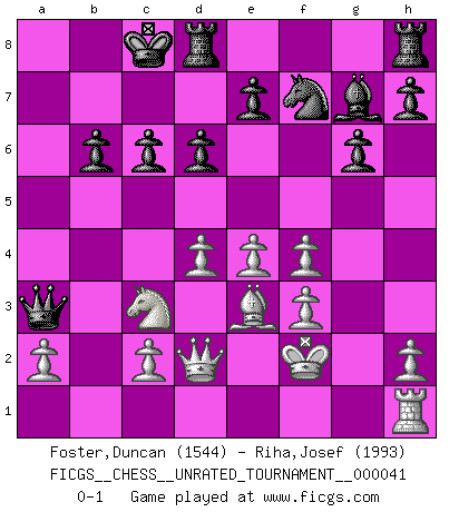Last move : 0-1 2015 May 8 15:49:7 [Event "FICGS__CHESS__UNRATED_TOURNAMENT__000041"] [Site "FICGS"] [Date "2015.04.30"] [Round "1"] [White "Foster,Duncan"] [Black "Riha,Josef"] [Result "0-1"] [WhiteElo "1544"] [BlackElo "1993"] 1.e4 g6 2.d4 Bg7 3.Nc3 d6 4.f4 c6 5.Nf3 Bg4 6.Be3 Qb6 7.Qd2 Bxf3 8.gxf3 Qxb2 9.Rb1 Qa3 10.Rxb7 Nd7 11.Bc4 Nb6 12.Bb3 O-O-O 13.Rxb6 axb6 14.Bxf7 Nh6 15.Kf2 Nxf7 0-1 Robatsch defense : Pseudo-Austrian attack Queenside Castling by player Black (move 12) Player Black won this chess game. Follow this game move after move (download)Winning isn't everything... but losing is nothing. (Mednis) Deine Wertungszahl - vorausgesetzt einige Jahre schachliche Anstrengung - entspricht etwa dem zehnfachen Deines IQ plus 1000. (Jonathan Levitt) Todo lo que importa ante el tablero de Ajedrez son buenas jugadas. (Bobby Fischer) Il n'y a pas eu de défaite parce que je ne crois pas que cet ordinateur ait jamais existé. IBM a triché en refusant d'imprimer les modes de recherche de la machine. C'est évident, pendant le match, des coups décisifs ont été joués par des êtres humains. Aujourd'hui, les meilleurs spécialistes en informatique ne peuvent toujours pas expliquer comment Deep-Blue a pu jouer contre la logique des ordinateurs. IBM a gagné une guerre de communication, mais ils sont incapables de prouver que l'ordinateur a gagné tout seul. (Garry Kasparov) Games, world of games... There's always an opponent, and there's always a victim. (Revolver, movie)