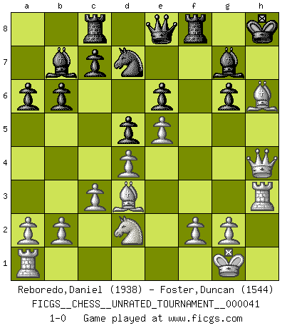 Last move : 1-0 2015 May 10 20:30:16 [Event "FICGS__CHESS__UNRATED_TOURNAMENT__000041"] [Site "FICGS"] [Date "2015.04.30"] [Round "1"] [White "Reboredo,Daniel"] [Black "Foster,Duncan"] [Result "1-0"] [WhiteElo "1938"] [BlackElo "1544"] 1.e4 b6 2.d4 Bb7 3.Bd3 g6 4.Qe2 a6 5.Nf3 h6 6.O-O d6 7.Bf4 Bg7 8.c3 e6 9.Nbd2 Ne7 10.Rfe1 O-O 11.h4 Nd7 12.e5 d5 13.Qe3 Kh7 14.h5 Qe8 15.Nh4 Nf5 16.Qh3 Nxh4 17.Qxh4 Kh8 18.hxg6 fxg6 19.Bxh6 Qf7 20.Re3 Rac8 21.Rf3 Qe8 22.Rh3 1-0 Owen defense Kingside Castling by player White (move 6) Kingside Castling by player Black (move 10) Player White won this chess game. Follow this game move after move (download)Chess is a beautiful mistress. (Bent Larsen) Ein unbeabsichtigtes Patt ist der Gipfel der Dummheit. (Anonymous) Una buena ofensiva y una buena defensa, comienzan ambas con un buen desarrollo. (Bruce A. Moon) Si je n'étais pas joueur d'échecs, je serais le meilleur dans quelque chose d'autre. (Anatoli Karpov) Creativity is allowing yourself to make mistakes. Art is knowing which ones to keep. (Scott Adams)
