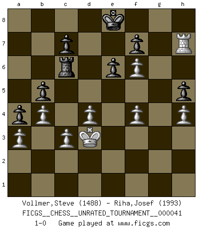 Last move : 1-0 2015 May 7 18:59:1 [Event "FICGS__CHESS__UNRATED_TOURNAMENT__000041"] [Site "FICGS"] [Date "2015.04.30"] [Round "1"] [White "Vollmer,Steve"] [Black "Riha,Josef"] [Result "1-0"] [WhiteElo "1488"] [BlackElo "1993"] 1.Nf3 d5 2.d4 Nf6 3.g3 e6 4.Bg2 Bb4+ 5.Bd2 Be7 6.O-O O-O 7.Nc3 Ne4 8.e3 Nxd2 9.Qxd2 Nc6 10.Ne2 b5 11.c3 Bb7 12.b4 a5 13.a3 g5 14.Qd3 Qd6 15.g4 Ba6 16.e4 dxe4 17.Qxe4 a4 18.Nxg5 Bxg5 19.Qxc6 Qxc6 20.Bxc6 Rad8 21.f4 Be7 22.Rad1 Rd6 23.Bf3 Bc8 24.Ng3 Rfd8 25.Ne4 Rb6 26.g5 Bb7 27.Nf6+ Bxf6 28.gxf6 Bd5 29.Kf2 Kh8 30.Rg1 Bxf3 31.Kxf3 Rc6 32.Rd3 Rg8 33.Rxg8+ Kxg8 34.Ke4 Rc4 35.Rg3+ Kf8 36.Kd3 Rc6 37.Rg7 h5 38.Rh7 Ke8 39.h4 1-0 Reti Opening Kingside Castling by player White (move 6) Kingside Castling by player Black (move 6) Player White won this chess game. Follow this game move after move (download)Whoever sees no other aim in the game than that of giving checkmate to one's opponent will never become a good Chess player. (Euwe) Ich spiele ehrlich und spiele, um zu gewinnen. Wenn ich verliere nehme ich meine Medizin. (Robert James Fischer) Los asuntos humanos son como una partida de Ajedrez: solo aquellos que no lo toman seriamente, pueden ser llamados buenos jugadores. (Hung Tzu Ch'eng) Il s'avisa de me proposer d'apprendre les échecs qu'il jouait un peu... me voilà forcené des échecs. J'achète un échiquier, je m'enferme dans ma chambre, j'y passe des jours et des nuits à vouloir apprendre par cur toutes les parties. (Jean-Jacques Rousseau, Confessions) Wawaweewa ! (Borat: Cultural learnings of America for make benefit glorious nation of Kazakhstan)