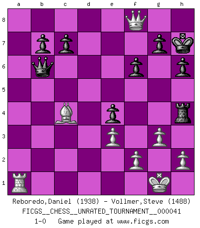 Last move : 1-0 2015 August 8 17:58:56 [Event "FICGS__CHESS__UNRATED_TOURNAMENT__000041"] [Site "FICGS"] [Date "2015.04.30"] [Round "1"] [White "Reboredo,Daniel"] [Black "Vollmer,Steve"] [Result "1-0"] [WhiteElo "1938"] [BlackElo "1488"] 1.c3 e5 2.c4 Nc6 3.Nc3 Nf6 4.g3 Bc5 5.Bg2 O-O 6.d3 d6 7.Nf3 h6 8.O-O Bf5 9.a3 a5 10.e3 Rc8 11.d4 Ba7 12.dxe5 dxe5 13.b4 Qe7 14.Nd5 Qe6 15.Bb2 Rfd8 16.b5 Nxd5 17.cxd5 Rxd5 18.Qa4 Nb4 19.axb4 Bd3 20.Rfd1 Bxb5 21.Qxa5 Bb6 22.Qa3 Rcd8 23.Rxd5 Rxd5 24.Nh4 e4 25.Qa8+ Kh7 26.Qf8 f6 27.Bd4 Ba6 28.Bf1 Rh5 29.Bxb6 Rxh4 30.b5 Bxb5 31.Bxb5 Qxb6 32.Bc4 1-0 Saragossa Opening Kingside Castling by player Black (move 5) Kingside Castling by player White (move 8) Player White won this chess game. Follow this game move after move (download)The mistakes are there, waiting to be made. (Savielly Tartakower) Der beste Spieler in einem Turnier gewinnt es nie. Er landet auf Platz zwei oder drei. (Siegbert Tarrasch) La mitad de las variaciones que son calculadas en una partida de torneo, resultan ser completamente superfluas. Desafortunadamente, nadie sabe por adelantado cual mitad. (Jan Tinman) J'ai toujours senti une vague pitié pour l'homme qui ne connaît rien aux échecs, tout comme j'en aurais pour un homme ignorant de l'amour. Les Echecs, comme la musique ou comme l'amour, ont le pouvoir de rendre heureux. (Siegbert Tarrasch) Life is like a play: it's not the length but the excellence of the acting that matters. (Seneca)