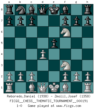 Last move : 1-0 2015 June 14 1:7:34 [Event "FICGS__CHESS__THEMATIC_TOURNAMENT__000191"] [Site "FICGS"] [Date "2015.05.01"] [Round "1"] [White "Reboredo,Daniel"] [Black "Zmolil,Josef"] [Result "1-0"] [WhiteElo "1938"] [BlackElo "1358"] 1.e4 e6 2.d4 d5 3.Nc3 dxe4 4.Nxe4 e5 5.Nf3 Nf6 6.Nxf6+ 1-0 This chess game has been lost on time (started : 2015.05.01 23:14:33) French : Rubinstein variation Player White won this chess game. Follow this game move after move (download)Chess demands total concentration. (Bobby Fischer) Als ich elf wurde, wurde ich einfach gut. (Robert James Fischer) Fischer es una tragedia del Ajedrez Americano a la par con Morphy y Pillsbury. (Mig Greengard) Les échecs, c'est l'art d'analyser. (Mikhail Botvinnik) Cactus - It is depressed cucumber. (Ilmars Cirulis)