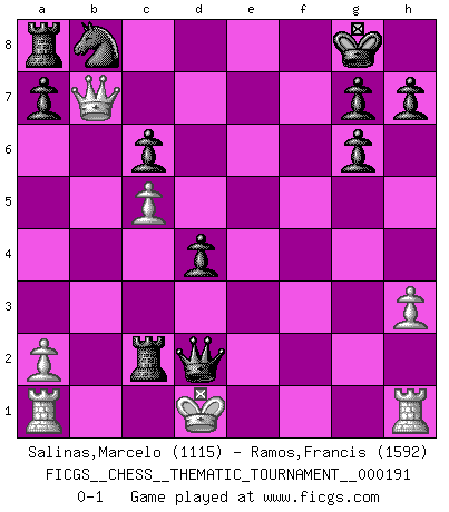 Last move : 0-1 2015 June 20 15:29:22 [Event "FICGS__CHESS__THEMATIC_TOURNAMENT__000191"] [Site "FICGS"] [Date "2015.05.01"] [Round "1"] [White "Salinas,Marcelo"] [Black "Ramos,Francis"] [Result "0-1"] [WhiteElo "1115"] [BlackElo "1592"] 1.e4 e6 2.d4 d5 3.Nc3 dxe4 4.Nxe4 e5 5.Nc5 exd4 6.b4 Nf6 7.Qf3 Qd5 8.Bb5+ c6 9.Bd3 Be7 10.h3 O-O 11.Qg3 Bxc5 12.bxc5 Bf5 13.Bh6 Bg6 14.Bxg6 fxg6 15.Bd2 Ne4 16.Qc7 Nxd2 17.Qxb7 Qxg2 18.Kxd2 Rxf2+ 19.Ne2 Rxe2+ 20.Kc1 Rxc2+ 21.Kd1 Qd2+ 0-1 French : Rubinstein variation Kingside Castling by player Black (move 10) Player Black won this chess game. Follow this game move after move (download)Chess is 99 percent tactics. (Teichmann) Es war undenkbar für die Behörden, dass ein sowjetischer Großmeister auf diese Art und Weise [Fischer-Taimanov 6:0] verliert, ohne dass es eine politischer Erklärung dafür gäbe. (Mark Taimanov) No solamente yo pronostico su triunfo sobre Botvinnik, sino que me adelanto y digo que probablemente Fischer es el jugador de Ajedrez mas grande que haya existido. (John Collins) Le jeu d'échecs fait naître et fortifie en nous plusieurs qualités précieuses dans le cours de l'existence, telles que la prévoyance, la circonspection, la prudence, et la persévérance. (Benjamin Franklin - 1783, la morale des échecs) Thus, what is of supreme importance in war is to attack the enemy's strategy. (Sun Tzu)