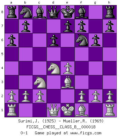 Last move : 0-1 2007 April 13 22:57:0 [Event "FICGS__CHESS__CLASS_B__000018"] [Site "FICGS"] [Date "2007.03.03"] [Round "1"] [White "Surimi,Jean-Eudes"] [Black "Mueller,Robert"] [Result "0-1"] [WhiteElo "1925"] [BlackElo "1969"] 1.e4 c5 2.Nf3 d6 3.d4 cxd4 4.Nxd4 Nf6 5.Nc3 a6 6.Be3 g6 0-1 This chess game has been lost on time (started : 2007.03.03 20:30:22) Sicilian : Najdorf, Byrne (English) attack Player Black won this chess game. Follow this game move after move (download)One of these modest little moves may be more embarrassing to your opponent than the biggest threat. (Siegbert Tarrasch) Im Wettkampf zwischen starken Meistern kommen Fehler sehr selten vor, deshalb ist es mit bloßem Warten nicht getan. (José Raúl Capablanca) Me dio la sensación de como si yo estuviera jugando en contra del mismo Ajedrez. - al estar jugando en contra de Robert Fischer (Walter Shipman) En blitz, le Cavalier l'emporte sur le Fou. (Vlastimil Hort) All the biggest technological inventions created by man - the airplane, the automobile, the computer - says little about his intelligence, but speaks volumes about his laziness. (Mark Kennedy)