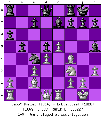 Last move : 1-0 2015 July 13 4:29:4 [Event "FICGS__CHESS__RAPID_B__000227"] [Site "FICGS"] [Date "2015.05.02"] [Round "1"] [White "Jabot,Daniel"] [Black "Lubas,Jozef"] [Result "1-0"] [WhiteElo "1814"] [BlackElo "1828"] 1.e4 e5 2.Nf3 Nc6 3.Bb5 a6 4.Ba4 Nf6 5.O-O Be7 6.Re1 b5 7.Bb3 O-O 8.c3 d5 9.d4 exd4 10.e5 Ne4 11.cxd4 Bg4 12.Nc3 Nxc3 13.bxc3 Na5 14.Bc2 Nc4 15.h3 Bh5 16.Bf4 1-0 This chess game has been lost on time (started : 2015.05.02 19:39:35) Ruy Lopez : Closed, 7...O-O Kingside Castling by player White (move 5) Kingside Castling by player Black (move 7) Player White won this chess game. Follow this game move after move (download)Play the opening like a book, the middle game like a magician, and the endgame like a machine. (Spielmann) Moralische Siege zählen nicht. (Savielly Grigorievitsch Tartakower) Desconfianza es la característica mas necesaria de un jugador de Ajedrez. (Siegbert Tarrasch) Nous vivons dans un monde échiquéen : chaque jour qui passe est un défi à relever. (Philosophe Sasha) Art is not a thing, it is a way. (Elbert Hubbard)