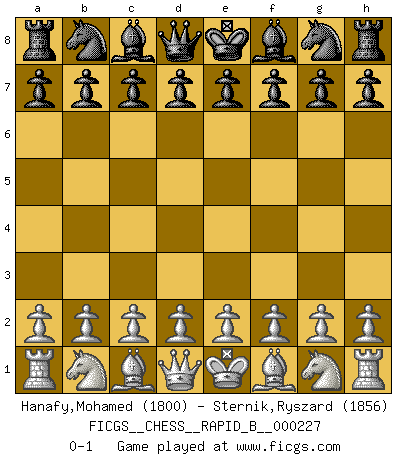 Last move : 0-1 2015 June 1 23:48:33 [Event "FICGS__CHESS__RAPID_B__000227"] [Site "FICGS"] [Date "2015.05.02"] [Round "1"] [White "Hanafy,Mohamed"] [Black "Sternik,Ryszard"] [Result "0-1"] [WhiteElo "1800"] [BlackElo "1856"] 0-1 This chess game has been lost on time (started : 2015.05.02 19:39:35) Player Black won this chess game. Follow this game move after move (download)I played Chess with him and would have beaten him sometimes only he always took back his last move, and ran the game out differently. (Mark Twain) Mit sehr nachdenklichem Gesicht schreitet Bobby durch den Turniersaal. Was ist passiert?, fragt Lombardy. Ich stehe schlecht, antwortet Fischer. Lombardy: Dann biete doch einfach Remis an. Fischer: So schlecht stehe ich nun auch wieder nicht! (Robert James Fischer) No volvere nunca a jugar contigo. Has insultado a mi amigo. - cuando un oponente se maldijo por una mala jugada (Miguel Najdorf) Les Echecs ont trois composantes : le temps, l'espace et le matériel en dernier. (Mikhail Tal) You must have a dream in order to have it come true. (A.P.J. Kalam)