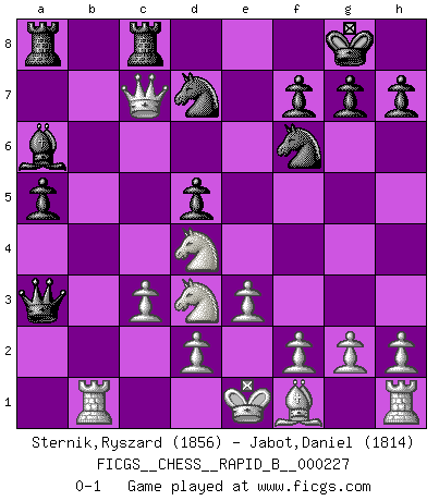 Last move : 0-1 2015 June 16 21:1:28 [Event "FICGS__CHESS__RAPID_B__000227"] [Site "FICGS"] [Date "2015.05.02"] [Round "1"] [White "Sternik,Ryszard"] [Black "Jabot,Daniel"] [Result "0-1"] [WhiteElo "1856"] [BlackElo "1814"] 1.b4 e5 2.Bb2 Bxb4 3.Bxe5 Nf6 4.Nc3 c6 5.Rb1 a5 6.Na4 b5 7.c3 Be7 8.Bd4 Bb7 9.Nf3 d5 10.Nc5 Bc8 11.Qc2 Bd6 12.a4 Qe7 13.Nd3 bxa4 14.Qxa4 O-O 15.Be5 Nbd7 16.Bxd6 Qxd6 17.Nd4 Ba6 18.Qxc6 Qa3 19.Qc7 Rfe8 20.e3 Rec8 0-1 Polish (Sokolsky) opening Kingside Castling by player Black (move 14) Player Black won this chess game. Follow this game move after move (download)Chess is really ninety nine percent calculation. (Soltis) Jeder Schachmeister war einmal ein Anfänger. (Irving Chernev) El poder defensivo de una pieza clavada, solamente es imaginario. (Aaron Nimzovich) L'ordinateur a tué l'originalité. Il n'y a plus guère d'aventures sur l'échiquier. (Jacob Murray) Pretend inferiority and encourage his arrogance. (Sun Tzu)