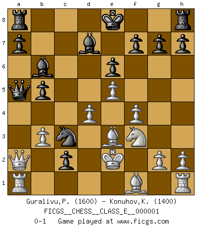 Last move : 0-1 2006 April 19 15:52:9 [Event "FICGS__CHESS__CLASS_E__000001"] [Site "FICGS"] [Date "2006.04.10"] [Round "1"] [White "Guralivu,Paul-Iosif"] [Black "Konuhov,Konstantin"] [Result "0-1"] [WhiteElo "1600"] [BlackElo "1400"] 1.e4 c5 2.f4 e6 3.Nc3 d5 4.e5 Ne7 5.Nf3 d4 6.Na4 Nd5 7.d3 Qa5+ 8.c3 Bd7 9.b3 dxc3 10.Ke2 b5 11.Nxc5 Bxc5 12.d4 Bb6 13.Qc2 Nc6 14.Be3 Ncb4 15.Qc1 Nxa2 16.Qb1 c2 17.Qxa2 Nc3+ 0-1 Sicilian : Grand Prix attack Player Black won this chess game. Follow this game move after move (download)Nonsense was the last thing Fischer was interested in, as far as Chess was concerned. (Elie Agur) Sie führen leise Selbstgespräche, schlürfen lautstark ihre Getränke, schmatzen hörbar beim Essen, blasen ihrem Gegenüber Rauch in die Augen, niesen ihm ins Gesicht, starren ihn unverwandt an, bis er sich unter ihren Blicken windet, rutschen ständig auf ihrem Stuhl hin und her, rülpsen und bohren in der Nase. (Anonymous) La partida mas dura de ganar es una partida ganada. (Emanuel Lasker) C'est la seule position que je connaisse où les deux camps sont mals. Propos prêtés à V. Anand. To steal ideas from one person is plagiarism. To steal from many is research. (Unknown)