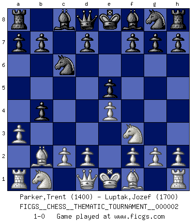 Last move : 1-0 2006 July 16 14:3:35 [Event "FICGS__CHESS__THEMATIC_TOURNAMENT__000002"] [Site "FICGS"] [Date "2006.05.30"] [Round "1"] [White "Parker,Trent"] [Black "Luptak,Jozef"] [Result "1-0"] [WhiteElo "1400"] [BlackElo "1700"] 1.e4 c5 2.b4 cxb4 3.a3 e5 4.Bb2 Nc6 5.Nf3 1-0 This chess game has been lost on time (started : 2006.05.30 1:4:16) Sicilian : wing gambit, Marshall variation Player White won this chess game. Follow this game move after move (download)Good positions don't win games, good moves do. (Gerald Abrahams) Modernes Schach erfordert enorme Anspannung. Es ist für einen normalen Menschen unmöglich das auszuhalten. (Viktor Kortschnoi) La táctica fluye a partir de una posición superior. (Bobby Fischer) En blitz, le Cavalier l'emporte sur le Fou. (Vlastimil Hort) If only people were all showed a certain minimum level of niceness; if only people didn't retract verbal draw offers (without draw box ticked) on ficgs; if only people didn't kill; if only people didn't run concentration / extermination camps, if only people didn't drop nuclear bombs on Hiroshima and Nagasaki, and so on - it would be a much more beautiful world. But sadly, things are not so... (Normajean Yates)