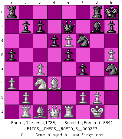 Last move : 0-1 2015 July 9 14:6:17 [Event "FICGS__CHESS__RAPID_B__000227"] [Site "FICGS"] [Date "2015.05.02"] [Round "1"] [White "Faust,Dieter"] [Black "Bonoldi,Fabio"] [Result "0-1"] [WhiteElo "1729"] [BlackElo "1884"] 1.d4 Nf6 2.c4 g6 3.Nc3 Bg7 4.e4 d6 5.Nf3 O-O 6.Be2 e5 7.O-O Nc6 8.d5 Ne7 9.Nd2 a5 10.a3 Nd7 11.h4 f5 12.exf5 gxf5 13.h5 Nf6 14.Nf3 f4 15.Re1 Nf5 16.Rb1 Kh8 17.Bd3 Rg8 18.Ng5 Qe7 19.Ne6 Bxe6 20.dxe6 Nh4 0-1 King's Indian : Orthodox, Aronin-Taimanov variation (Yugoslav attack / Mar del Plata variation) Kingside Castling by player Black (move 5) Kingside Castling by player White (move 7) Player Black won this chess game. Follow this game move after move (download)No one ever won a game by resigning. (Unknown) Wenn man heute mit 14 Jahren noch kein GM ist, kann man es vergessen. (Viswanathan Anand) Te sientas frente a un tablero y repentinamente tu corazón brinca. Tu mano tiembla al tomar una pieza y moverla. Pero lo que el Ajedrez te enseña es que tu debes permanecer ahí con calma y pensar de que si realmente es una buena idea o de que si hay otras ideas mejores. (Stanley Kubrick) Les sacrifices démontrent seulement que quelqu'un a gaffé. (Savielly Tartacover) Those who make the worst use of their time are the first to complain of its brevity. (Jean de la Bruyere)