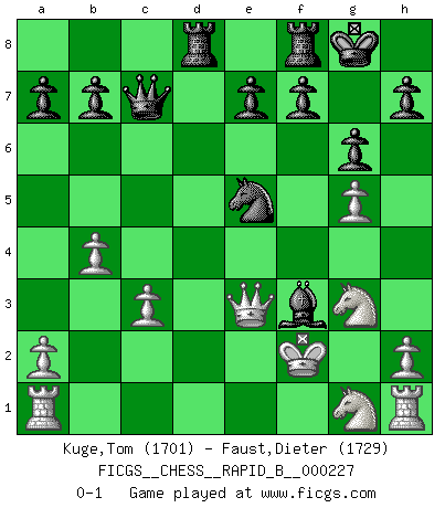 Last move : 0-1 2015 May 29 18:13:52 [Event "FICGS__CHESS__RAPID_B__000227"] [Site "FICGS"] [Date "2015.05.02"] [Round "1"] [White "Kuge,Tom"] [Black "Faust,Dieter"] [Result "0-1"] [WhiteElo "1701"] [BlackElo "1729"] 1.e4 d6 2.d4 Nf6 3.Nc3 g6 4.Be2 Bg7 5.Be3 O-O 6.g4 c5 7.g5 Ng4 8.Bxg4 Bxg4 9.f3 cxd4 10.Bxd4 Bxd4 11.Qxd4 Nc6 12.Qe3 Bh5 13.Nce2 Qa5+ 14.c3 Rad8 15.Ng3 d5 16.Kf2 dxe4 17.Nxe4 Ne5 18.b4 Qc7 19.Ng3 Bxf3 0-1 Pirc defense Kingside Castling by player Black (move 5) Player Black won this chess game. Follow this game move after move (download)The way he plays Chess demonstrates a man's whole nature. (Stanley Ellin) Ich verachte die Medien. (Robert James Fischer) Yo adoro todas la posiciones. Denme una partida posicional difícil, y la jugaré. Pero posiciones totalmente ganadas, no las tolero. (Hein Donner) Comme les marins qui ont mille raisons différentes d'aller en mer, les joueurs d'échecs en ont tout autant avant de s'installer devant une table et jouer... (Vincent Bertignac, philosophe) The message for business people contemplating their place in the cyberspace is simple and direct: get linked or get lost. (Vic Sussman and Kenan Pollack)