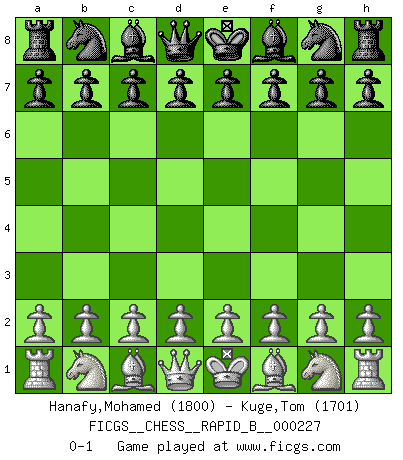 Last move : 0-1 2015 June 1 23:48:33 [Event "FICGS__CHESS__RAPID_B__000227"] [Site "FICGS"] [Date "2015.05.02"] [Round "1"] [White "Hanafy,Mohamed"] [Black "Kuge,Tom"] [Result "0-1"] [WhiteElo "1800"] [BlackElo "1701"] 0-1 This chess game has been lost on time (started : 2015.05.02 19:39:35) Player Black won this chess game. Follow this game move after move (download)Chess is a part of culture and if a culture is declining then Chess too will decline. (Mikhail Botvinnik) Im Internet Chess Club betrug mein Rating vorübergehend 3350 ELO-Punkte. (Sergej Karjakin) Juega la Apertura como un libro, el Juego Medio como un mago y los Finales como una máquina. (Spielmann) La vie est comme un jeu d'échecs : nous esquissons un plan, mais celui-ci est tributaire de ce que daignent faire l'adversaire aux échecs et le destin dans la vie. (Arthur Schopenhauer) The intuitive mind is a sacred gift; the rational mind is a faithful servant. We have created a society that honors the servant but has forgotten the gift. (Albert Einstein)