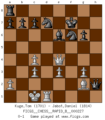 Last move : 0-1 2015 June 6 11:41:36 [Event "FICGS__CHESS__RAPID_B__000227"] [Site "FICGS"] [Date "2015.05.02"] [Round "1"] [White "Kuge,Tom"] [Black "Jabot,Daniel"] [Result "0-1"] [WhiteElo "1701"] [BlackElo "1814"] 1.Nf3 d5 2.c4 d4 3.b4 f6 4.Bb2 e5 5.e3 dxe3 6.fxe3 Bxb4 7.Bxe5 fxe5 8.Nxe5 Qh4+ 9.g3 Qe4 10.Qh5+ g6 11.Nxg6 hxg6 12.Qxh8 Be6 13.Qd4 Qxh1 14.Nc3 Bxc3 15.dxc3 Nd7 16.O-O-O Qxh2 17.Qe4 Kf7 18.Bg2 Ngf6 0-1 Reti : Advance variation Queenside Castling by player White (move 16) Player Black won this chess game. Follow this game move after move (download)The passed Pawn is a criminal, who should be kept under lock and key. Mild measures, such as police surveillance, are not sufficient. (Aaron Nimzovich) Rubinstein ist ein Turmendspiel, welches die Götter vor tausenden von Jahren begannen. (Savielly Grigorievitsch Tartakower) El Ajedrez es el juego mas altamente simbólico, pero las agresiones estan por lo tanto aún mas francamente representadas en la partida. Tal vez comenzo como un juego de guerra; Algo como la representación de una batalla en miniatura entre las fuerzas de dos reinos. (Karl Meninger) Vous n'êtes pas toujours obligé de jouer le meilleur coup. Un coup doit être actif, entreprenant, correct et beau ! (David Bronstein) Plans are ideas that never come to fruition. (Daniel Parmet)