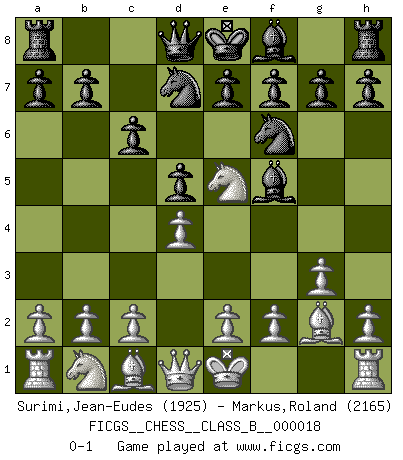 Last move : 0-1 2007 April 15 11:9:8 [Event "FICGS__CHESS__CLASS_B__000018"] [Site "FICGS"] [Date "2007.03.03"] [Round "1"] [White "Surimi,Jean-Eudes"] [Black "Markus,Roland"] [Result "0-1"] [WhiteElo "1925"] [BlackElo "2165"] 1.Nf3 Nf6 2.g3 d5 3.Bg2 c6 4.d4 Bf5 5.Ne5 Nbd7 0-1 This chess game has been lost on time (started : 2007.03.03 20:30:22) Reti Opening Player Black won this chess game. Follow this game move after move (download)Openings teach you openings. Endgames teach you chess ! (Stephan Gerzadowicz) Ein Großmeister muß tausende Partien in seinem Kopf speichern, denn diese sind für Ihn, was die Worte der Muttersprache für gewöhnliche Leute sind, oder Noten für Musiker... (Garry Kasparov) La vida es como el Ajedrez, con lucha, competición y eventos buenos y malos. (Benjamin Franklin) Fischer est le meilleur joueur du monde et Karpov n'est qu'un joueur de bistrot. (Garry Kasparov, agé de 16 ans) Are you threatening me, Master Jedi ? (Chancellor Palpatine in Star Wars ep.3)