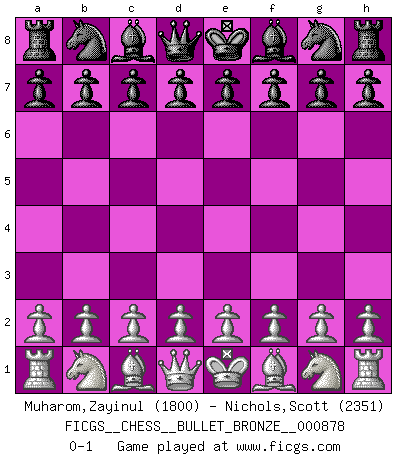Last move : 0-1 2015 May 3 21:9:31 [Event "FICGS__CHESS__BULLET_BRONZE__000878"] [Site "FICGS"] [Date "2015.05.03"] [Round "1"] [White "Muharom,Zayinul"] [Black "Nichols,Scott"] [Result "0-1"] [WhiteElo "1800"] [BlackElo "2351"] 0-1 This chess game has been lost on time (started : 2015.05.03 14:40:53) Player Black won this chess game. Follow this game move after move (download)Many have become Chess Masters, no one has become the Master of Chess. (Siegbert Tarrasch) Das Blackmar-Diemer-Gambit verändert den ganzen Menschen! (Emil Joseph Diemer) El Ajedrez es un juego terrible. Si no dominas el centro, tu oponente tiene una posición mas libre. Si tu tienes el centro, entonces realmente tienes algo de que preocuparte. (Siegbert Tarrasch) Des points faibles ou des trous dans la position de l'adversaire doivent être occupés par des pièces et non pas par des pions. (Siegbert Tarrasch) As a goal marker shodan is important. As a destination it is a poor place to stop. (Thomas Tamayo)