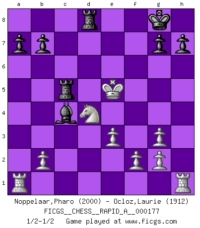 Last move : 1/2-1/2 2015 May 8 16:59:28 [Event "FICGS__CHESS__RAPID_A__000177"] [Site "FICGS"] [Date "2015.05.04"] [Round "1"] [White "Noppelaar,Pharo"] [Black "Ocloz,Laurie"] [Result "1/2-1/2"] [WhiteElo "2000"] [BlackElo "1912"] 1.d4 Nf6 2.Bf4 c5 3.e3 d5 4.c3 Nc6 5.Nd2 Bf5 6.Ngf3 Qb6 7.Nh4 Bd7 8.Qb3 Qxb3 9.axb3 Nh5 10.Bg3 e6 11.Bd3 Rc8 12.Nhf3 f6 13.dxc5 Bxc5 14.b4 Bxb4 15.cxb4 Nxb4 16.Ke2 Nxg3+ 17.hxg3 Nxd3 18.Kxd3 Bb5+ 19.Kd4 e5+ 20.Nxe5 fxe5+ 21.Kxe5 O-O 22.Nf3 Rfe8+ 23.Kd4 Re4+ 24.Kxd5 R4e8 25.Nd4 Bc4+ 26.Kd6 Red8+ 27.Ke5 Rc5+ 1/2-1/2 Michael Hansen I have too many games, and I'm trying to finish them all and take a break from chess. Thank you very much for a great game! Queen's pawn game Kingside Castling by player Black (move 21) This chess game ended in a draw. Follow this game move after move (download)I don't believe in psychology. I believe in good moves. (Bobby Fischer) Ich suche im Schach immer etwas Eigenes. Riskantes Spiel im Stile schachlicher Musketiere ist nicht meine Sache, auch wenn es vielen Freunden scharfer Wendungen gefällt. (Anatoly Karpov) ¿Que sería del Ajedrez sin errores graciosos?. (Kurt Richter) Le profane ne songe pas à la somme de jouissance dont il se prive, qui méconnaît ce jeu aux ressources aussi variées que passionnantes. (Jean-Marie Jeanton-Lamarche) The ego is not master in its own house. (Sigmund Freud)