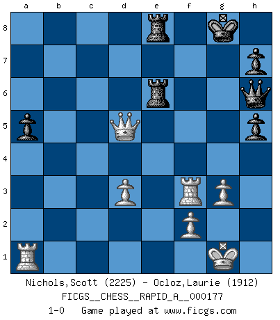 Last move : 1-0 2015 May 10 17:49:59 [Event "FICGS__CHESS__RAPID_A__000177"] [Site "FICGS"] [Date "2015.05.04"] [Round "1"] [White "Nichols,Scott"] [Black "Ocloz,Laurie"] [Result "1-0"] [WhiteElo "2225"] [BlackElo "1912"] 1.e4 c5 2.Nf3 Nc6 3.Bb5 g6 4.Bxc6 dxc6 5.d3 Bg7 6.h3 b6 7.O-O Nf6 8.Nc3 Qc7 9.e5 Nd5 10.Ne4 f5 11.Ng3 Qd7 12.Bd2 Bb7 13.Re1 O-O 14.Ne2 Nc7 15.Nf4 e6 16.c4 Qe7 17.h4 a5 18.Qb3 Ra6 19.a4 Rb8 20.Rad1 R6a8 21.Nh3 b5 22.h5 gxh5 23.Bg5 Qf7 24.Nf4 Bc8 25.Qc2 Bd7 26.Bf6 Bxf6 27.exf6 Qxf6 28.cxb5 Qh6 29.g3 cxb5 30.Qxc5 Rb7 31.axb5 Nxb5 32.Nxe6 Rc8 33.Qxf5 Nd6 34.Qd5 Bc6 35.Qxd6 Bxf3 36.Ra1 Rxb2 37.Qe5 Rb6 38.Re3 Re8 39.Rxf3 Rbxe6 40.Qd5 1-0 Sicilian : Nimzovich-Rossolimo attack (with ...g6, without ...d6) Kingside Castling by player White (move 7) Kingside Castling by player Black (move 13) Player White won this chess game. Follow this game move after move (download)Chess, like love, is infectious at any age. (Flohr) Ja, jede Frau in Holland liebt mich bestimmt, und alle Männer hassen mich. (Loek van Wely) Debió haber existido una vez en que los hombres eran semidióses, de otra manera no hubiesen podido inventar el Ajedrez. (Gustav Schenk) 'L'échange des dames est un coup dur pour les deux adversaires...' Un journaliste lors d'une partie du match Spassky-Fischer The meaning of life is that it is to be lived, and it is not to be traded and conceptualized and squeezed into a pattern of systems. (Bruce Lee)