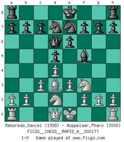 Last move : 1-0 2015 June 21 13:41:23 [Event "FICGS__CHESS__RAPID_A__000177"] [Site "FICGS"] [Date "2015.05.04"] [Round "1"] [White "Reboredo,Daniel"] [Black "Noppelaar,Pharo"] [Result "1-0"] [WhiteElo "1938"] [BlackElo "2000"] 1.c3 d5 2.d4 Bf5 3.Nf3 e6 4.Bf4 Bd6 5.Bxd6 Qxd6 6.e3 Nd7 7.Bd3 Ne7 8.Nbd2 1-0 This chess game has been lost on time (started : 2015.05.04 15:37:57) Saragossa Opening Player White won this chess game. Follow this game move after move (download)Spassky will not be psyched out by Fischer. (Mike Goodall) Ich liebe den Moment, wenn ich das Ego meines Gegenüber breche. (Robert James Fischer) El Ajedrez es de 30 a 40 por ciento psicología. Uno no cuenta con esto cuando se juega contra una computadora. No lo puedo confundir. (Judith Polgar) Nous sommes les pions de la mystérieuse partie d'Echecs jouée par Dieu. Il nous déplace, nous arrête, nous pousse encore, puis nous lance un à un dans la boîte du Néant. Epitaphe sur la tombe de David Janowsky (1868-1927). Treat your password like your toothbrush. Don't let anybody else use it, and get a new one every six months. (Clifford Stoll)