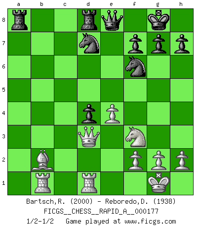 Last move : 1/2-1/2 2015 June 6 19:51:46 [Event "FICGS__CHESS__RAPID_A__000177"] [Site "FICGS"] [Date "2015.05.04"] [Round "1"] [White "Bartsch,Reinhard Andrea"] [Black "Reboredo,Daniel"] [Result "1/2-1/2"] [WhiteElo "2000"] [BlackElo "1938"] 1.d4 d5 2.c4 c6 3.Nf3 Nf6 4.e3 e6 5.Nc3 Nbd7 6.Qc2 Bd6 7.Bd3 O-O 8.O-O dxc4 9.Bxc4 b5 10.Bd3 Bb7 11.a3 a6 12.b4 a5 13.Rb1 axb4 14.axb4 Qe7 15.e4 e5 16.Qb3 Rfd8 17.Rd1 Qe8 18.Ne2 exd4 19.Nexd4 Bxb4 20.Qxb4 c5 21.Qxb5 Ba6 22.Qb3 Bxd3 23.Qxd3 cxd4 24.Bb2 1/2-1/2 QGD Slav : 4.e3 Kingside Castling by player Black (move 7) Kingside Castling by player White (move 8) This chess game ended in a draw. Follow this game move after move (download)A good player is always lucky. (Jose Raul Capablanca) Im Wettkampf zwischen starken Meistern kommen Fehler sehr selten vor, deshalb ist es mit bloßem Warten nicht getan. (José Raúl Capablanca) Me dio la sensación de como si yo estuviera jugando en contra del mismo Ajedrez. - al estar jugando en contra de Robert Fischer (Walter Shipman) En blitz, le Cavalier l'emporte sur le Fou. (Vlastimil Hort) Question: Is 'This statement is paradoxical' a paradoxical statement ? Or is it a meta-paradox ? (Normajean Yates)