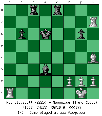 Last move : 1-0 2015 July 6 15:23:39 [Event "FICGS__CHESS__RAPID_A__000177"] [Site "FICGS"] [Date "2015.05.04"] [Round "1"] [White "Nichols,Scott"] [Black "Noppelaar,Pharo"] [Result "1-0"] [WhiteElo "2225"] [BlackElo "2000"] 1.e4 e5 2.Nf3 Nf6 3.Nxe5 Nxe4 4.Qe2 Qe7 5.Qxe4 d6 6.d4 dxe5 7.dxe5 Nc6 8.Bb5 Bd7 9.Nc3 Qb4 10.Bc4 O-O-O 11.a3 Qa5 12.Bxf7 Nxe5 13.b4 Bxb4 14.Qxb4 Qxb4 15.axb4 Nxf7 16.Rxa7 Kb8 17.Ra1 Rhe8+ 18.Be3 Bf5 19.O-O Bxc2 20.Ra2 Bb3 21.Ra3 Bc4 22.Rfa1 b6 23.Bd4 g6 24.Bf6 Rc8 25.b5 c6 26.Ra6 Kc7 27.Ra7+ Kd6 28.Bh4 cxb5 29.Nxb5+ Bxb5 30.Rxf7 Bd3 31.Rxh7 1-0 This chess game has been lost on time (started : 2015.05.04 15:37:57) Petrov : Damiano variation Queenside Castling by player Black (move 10) Kingside Castling by player White (move 19) Player White won this chess game. Follow this game move after move (download)Everything is in a state of flux, and this includes the world of Chess. (Mikhail Botvinnik) Ich verstehe mehr vom Schach als irgendein anderer lebender Meister. (José Raúl Capablanca) Aún deseo matar a Fischer. (Boris Spassky) Tout change constamment, y compris dans le monde des Echecs. (Botvinnik) Creativity is allowing yourself to make mistakes. Art is knowing which ones to keep. (Scott Adams)