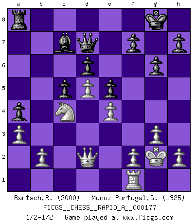 Last move : 1/2-1/2 2015 May 31 7:35:24 [Event "FICGS__CHESS__RAPID_A__000177"] [Site "FICGS"] [Date "2015.05.04"] [Round "1"] [White "Bartsch,Reinhard Andrea"] [Black "Munoz Portugal,Guillermo"] [Result "1/2-1/2"] [WhiteElo "2000"] [BlackElo "1925"] 1.d4 Nf6 2.c4 e6 3.Nf3 b6 4.g3 Bb7 5.Bg2 Be7 6.O-O O-O 7.Nc3 Ne4 8.Bd2 Nxd2 9.Qxd2 d6 10.Rad1 c6 11.e4 Nd7 12.Rfe1 Qc7 13.d5 cxd5 14.cxd5 e5 15.Rc1 a5 16.a3 Nc5 17.Qd1 Ba6 18.Bf1 Bxf1 19.Rxf1 Rfc8 20.Kg2 g6 21.Na4 Qb7 22.Nxc5 Rxc5 23.Rxc5 bxc5 24.Qc2 a4 25.Nd2 Qd7 26.Nc4 Bd8 27.Qd2 Bc7 1/2-1/2 Queen's Indian : Old Main line, 7.Nc3 Kingside Castling by player White (move 6) Kingside Castling by player Black (move 6) This chess game ended in a draw. Follow this game move after move (download)I give 98 percent of my mental energy to Chess. Others give only 2 percent. (Bobby Fischer) Schach ist Leben. (Robert James Fischer) El Ajedrez no es como la vida... ¡tiene reglas!. (Mark Pasternak) On peut tirer plus d'utilité d'une partie perdue que de 100 parties gagnées. (Capablanca) Without deviation from the norm, progress is not possible. (Frank Zappa)